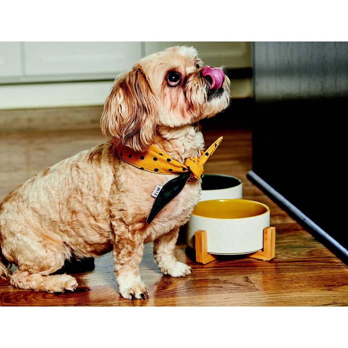 Your dog can eat in style with our Ceramic Dog Bowls with bamboo stand - cream speckled matte exterior and ochre yellow gloss interior with decal.