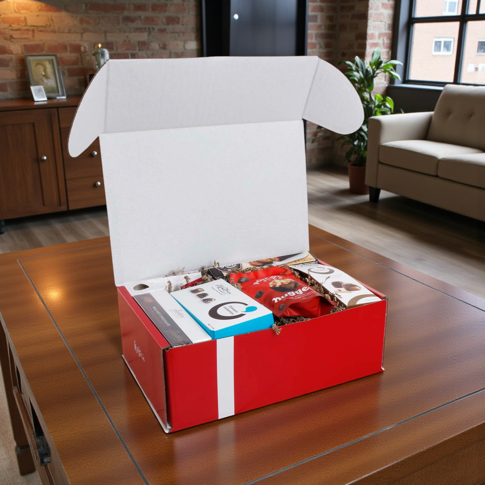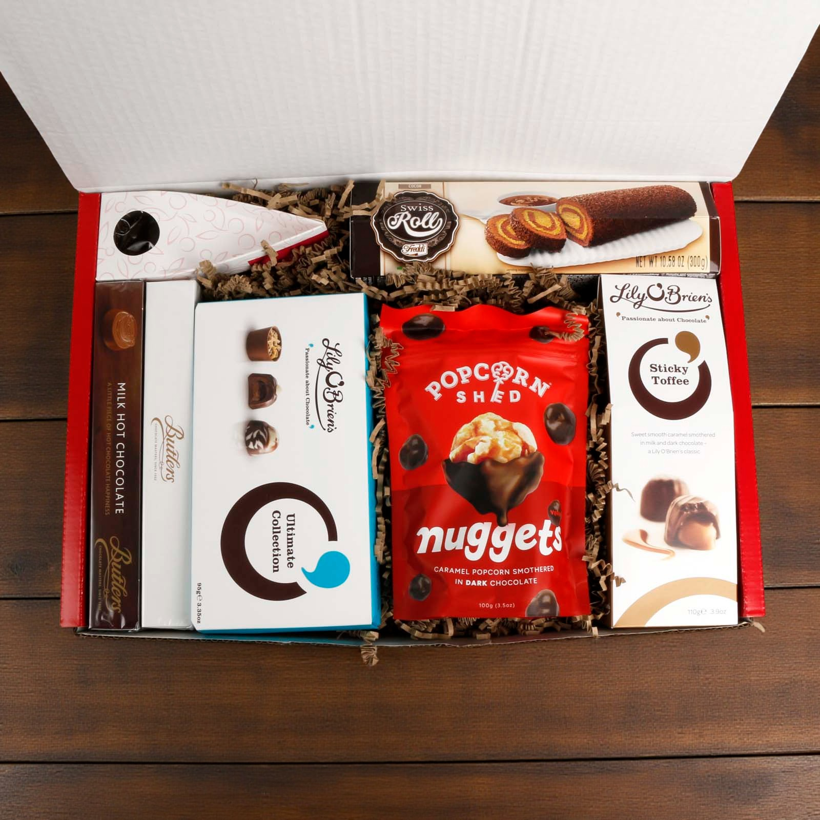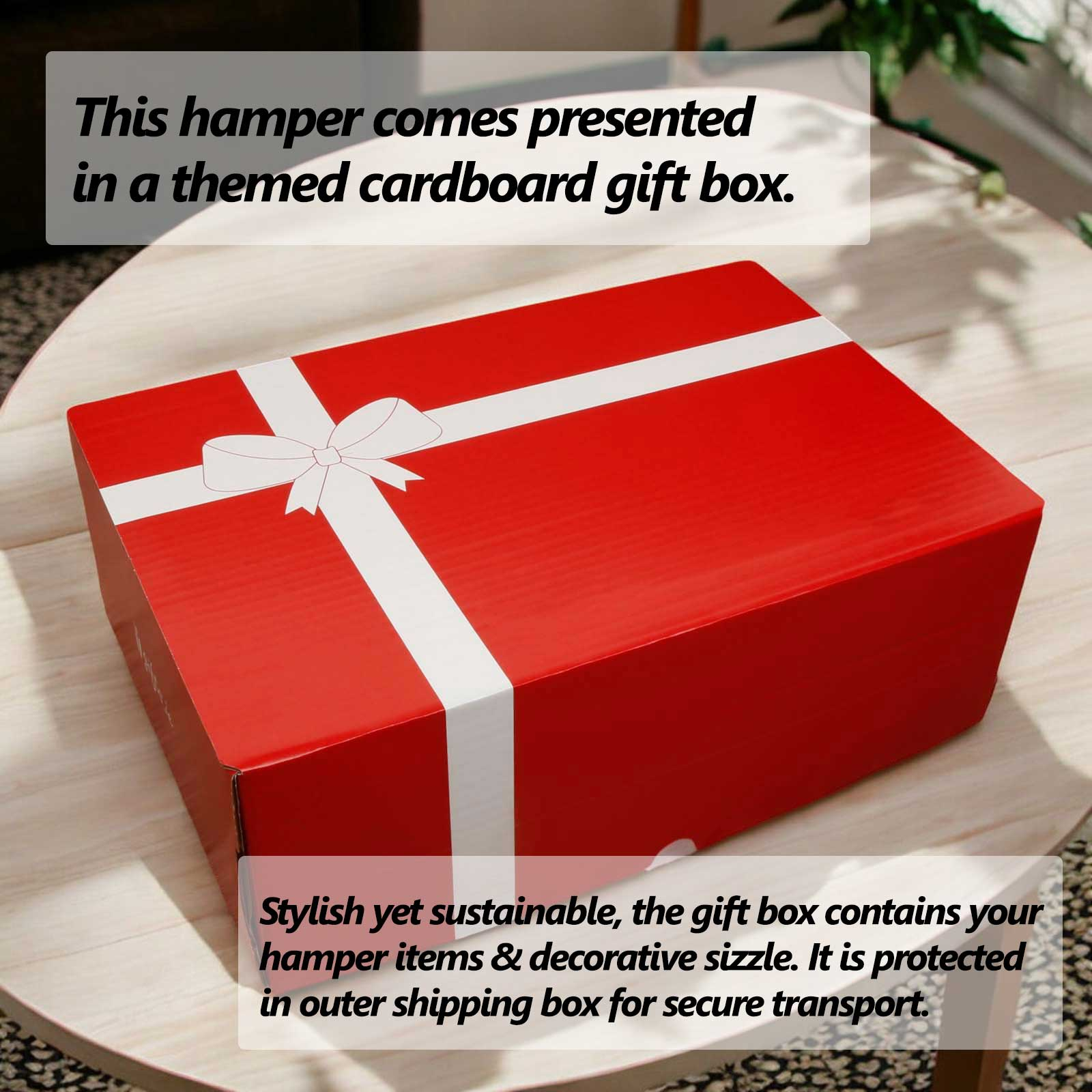 The hamper is presented in our new red gift box. Stylish and reusable, the gift box is packed inside a separate shipping box for secure transport.