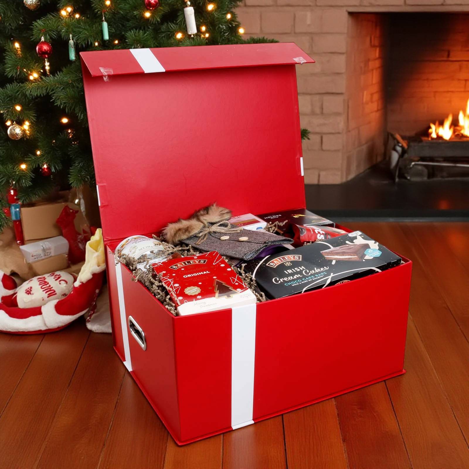 The hamper is presented in our new luxury red gift box with satin bow. Stylish and reusable, the gift box is packed inside a separate shipping box for secure transport.