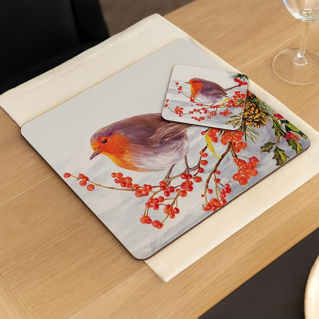 Give the gift of festive charm and practical elegance with the Newgrange Living Christmas Robin Placemat & Coaster Set – ideal for making holiday memories even more special.