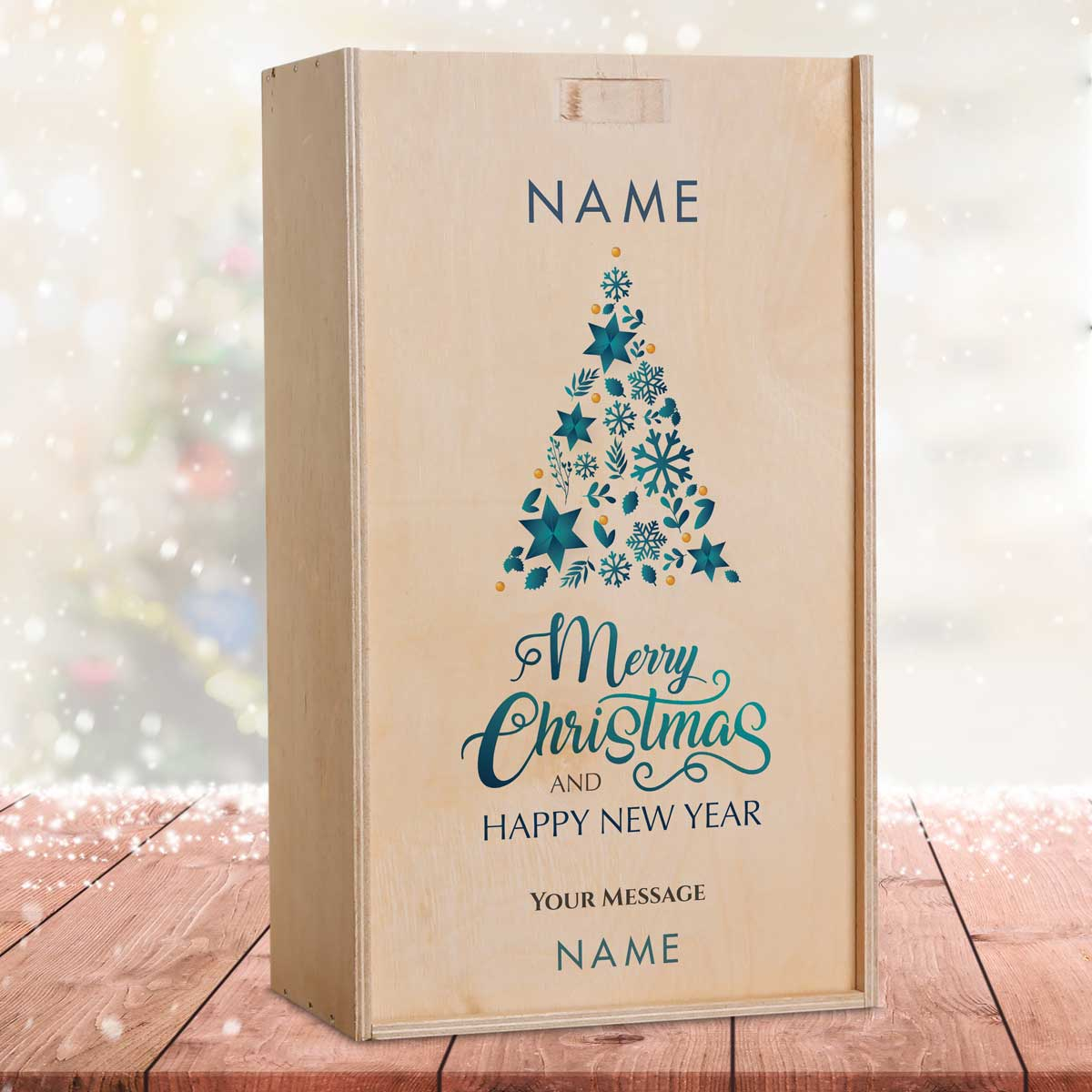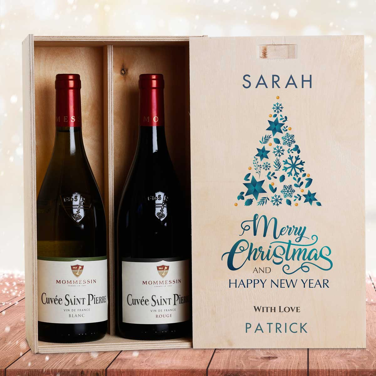 This personalised wine box with two bottles of wine makes the perfect Christmas gift.