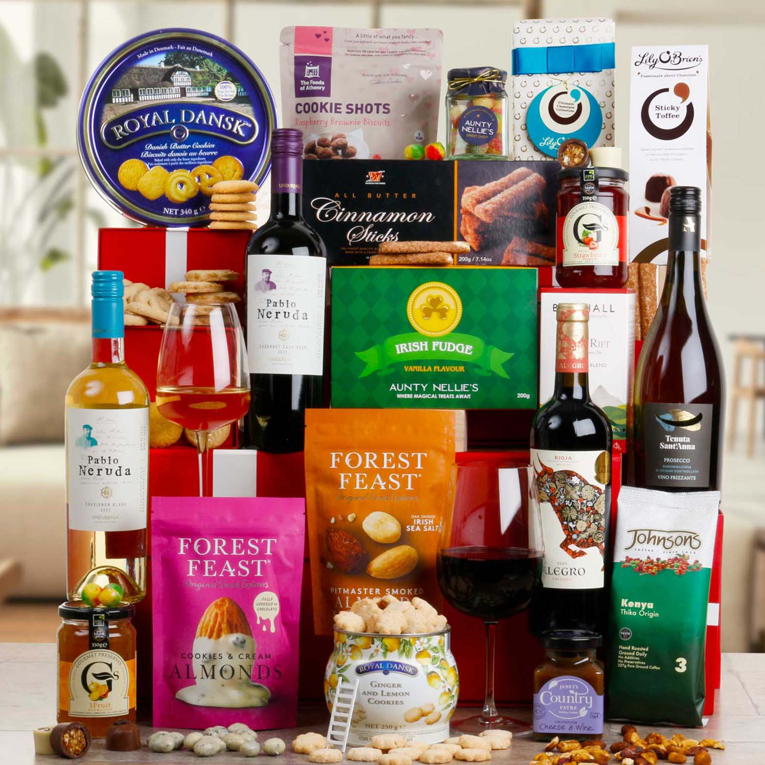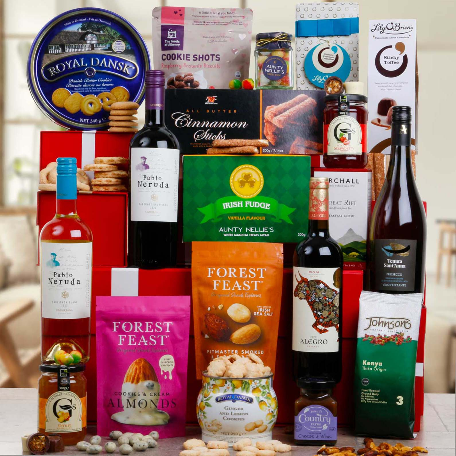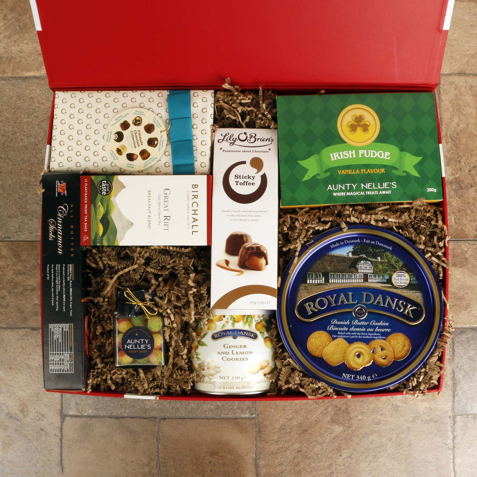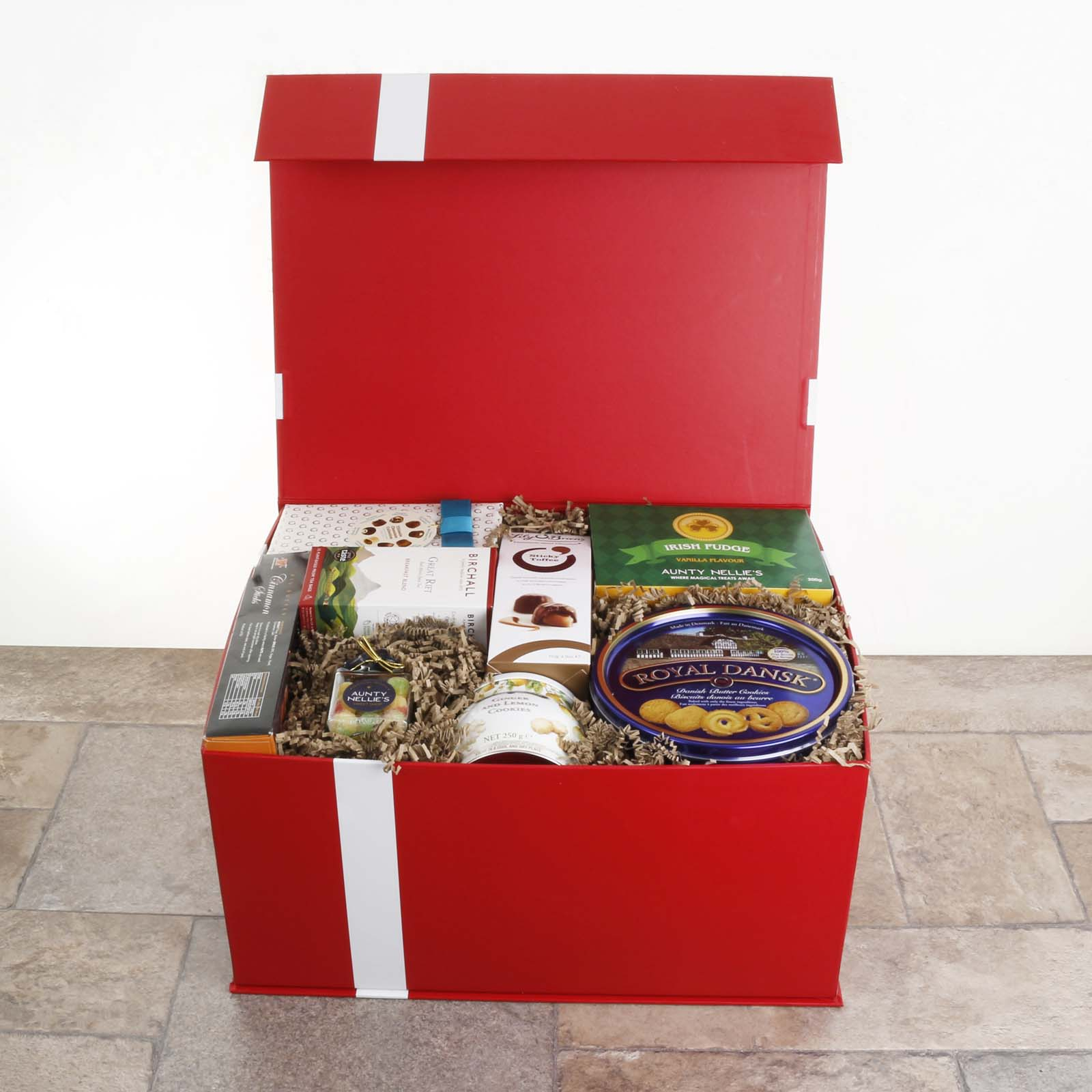 The hamper is presented in our new luxury red gift box with satin bow. Stylish and reusable, the gift box is packed inside a separate shipping box for secure transport.