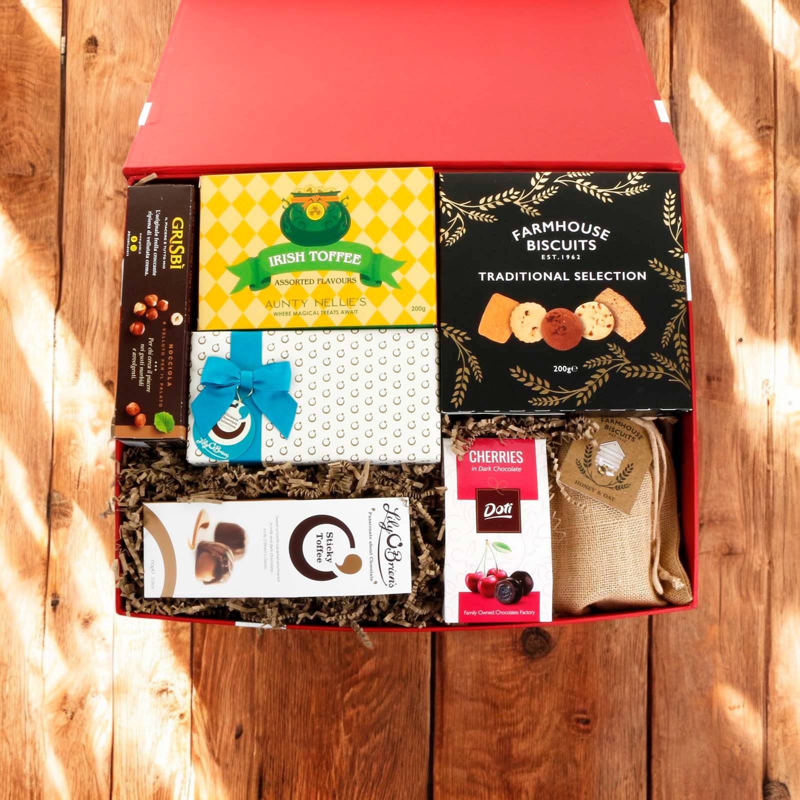 The hamper is presented in our new luxury red gift box with satin bow. Stylish and reusable, the gift box is packed inside a separate shipping box for secure transport.