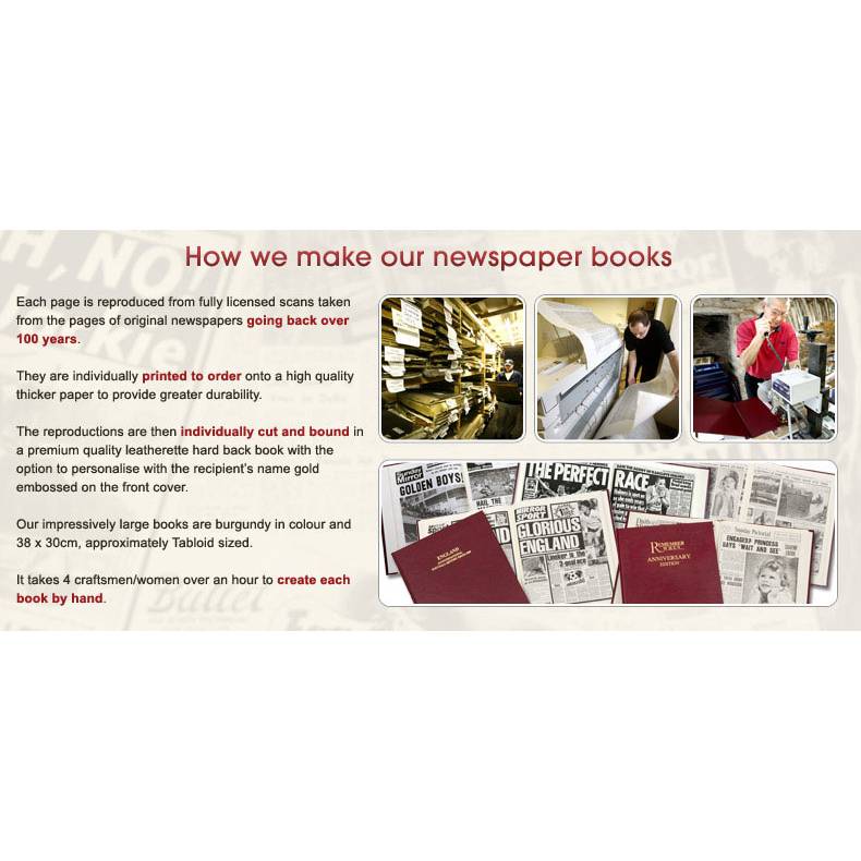A wonderful insight into a favourite team: their history, the highs and lows, the inside stories, the gossip. The book opens with a front page montage of the team's famous players surrounding a personalised label containing the recipient’s name and greeting. This individually bound, embossed hard back book is tabloid size (38 x 30cm) for convenient storage and handling and holds the historical news reports of the chosen team.