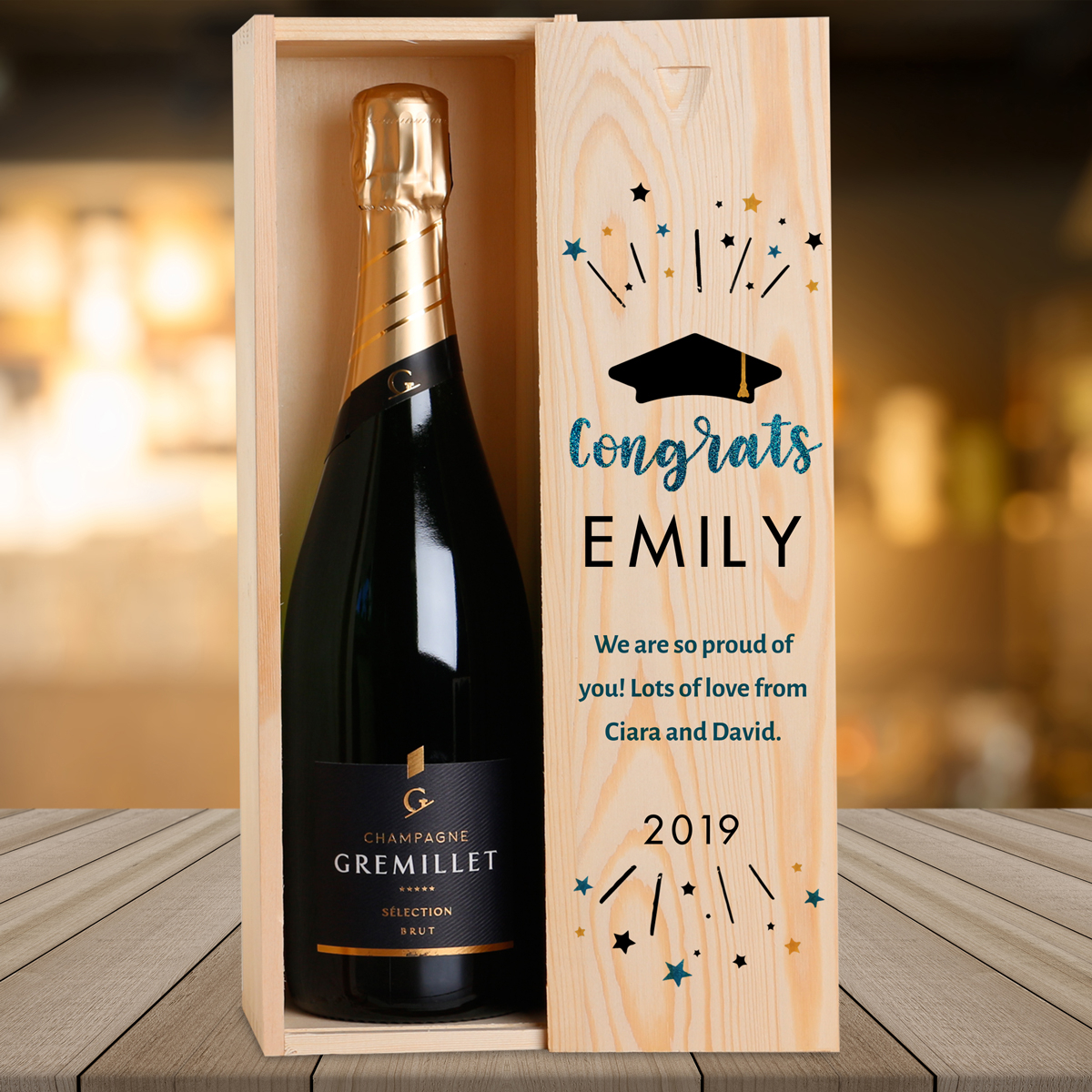 This personalised wooden box with a bottle of Champagne makes the perfect gift.
