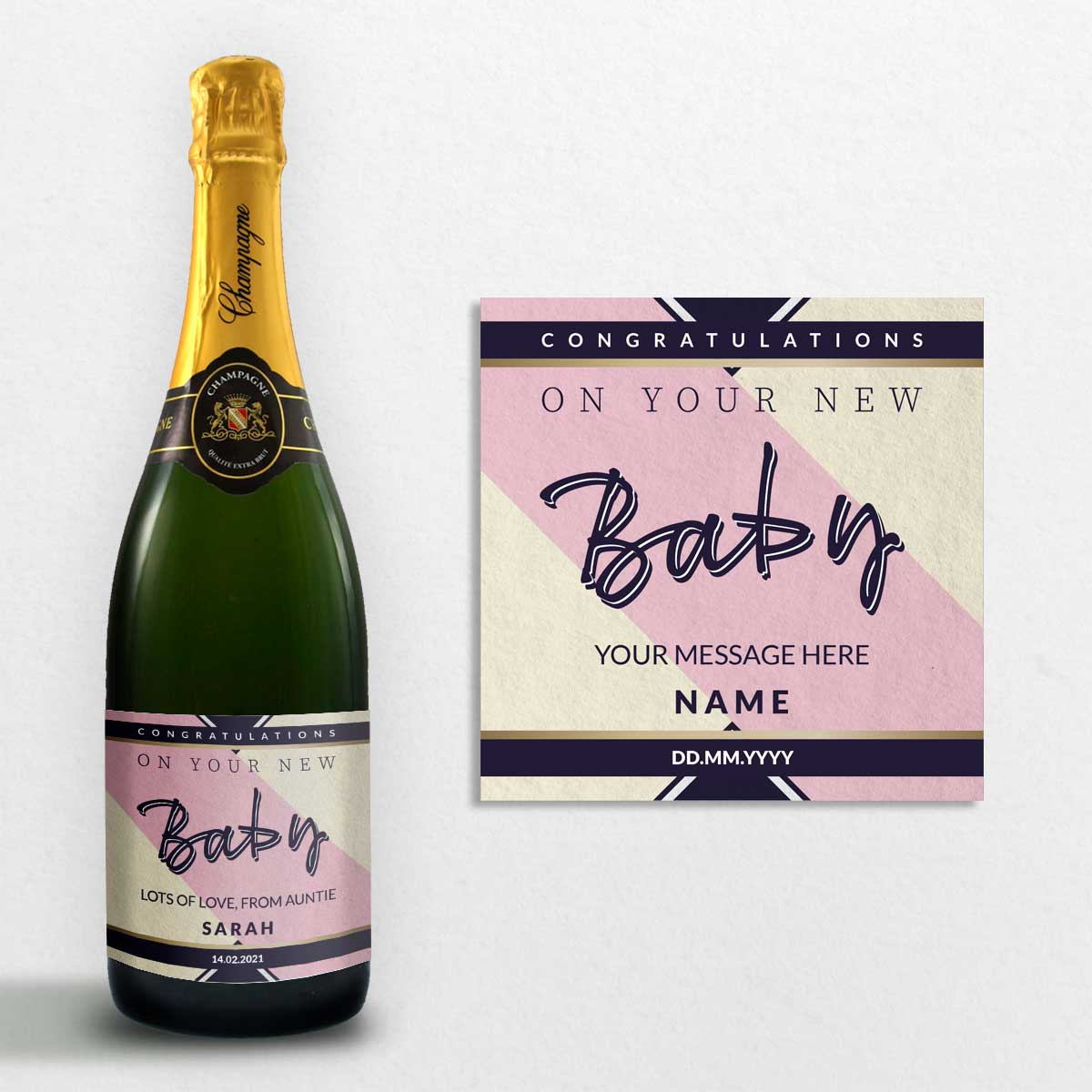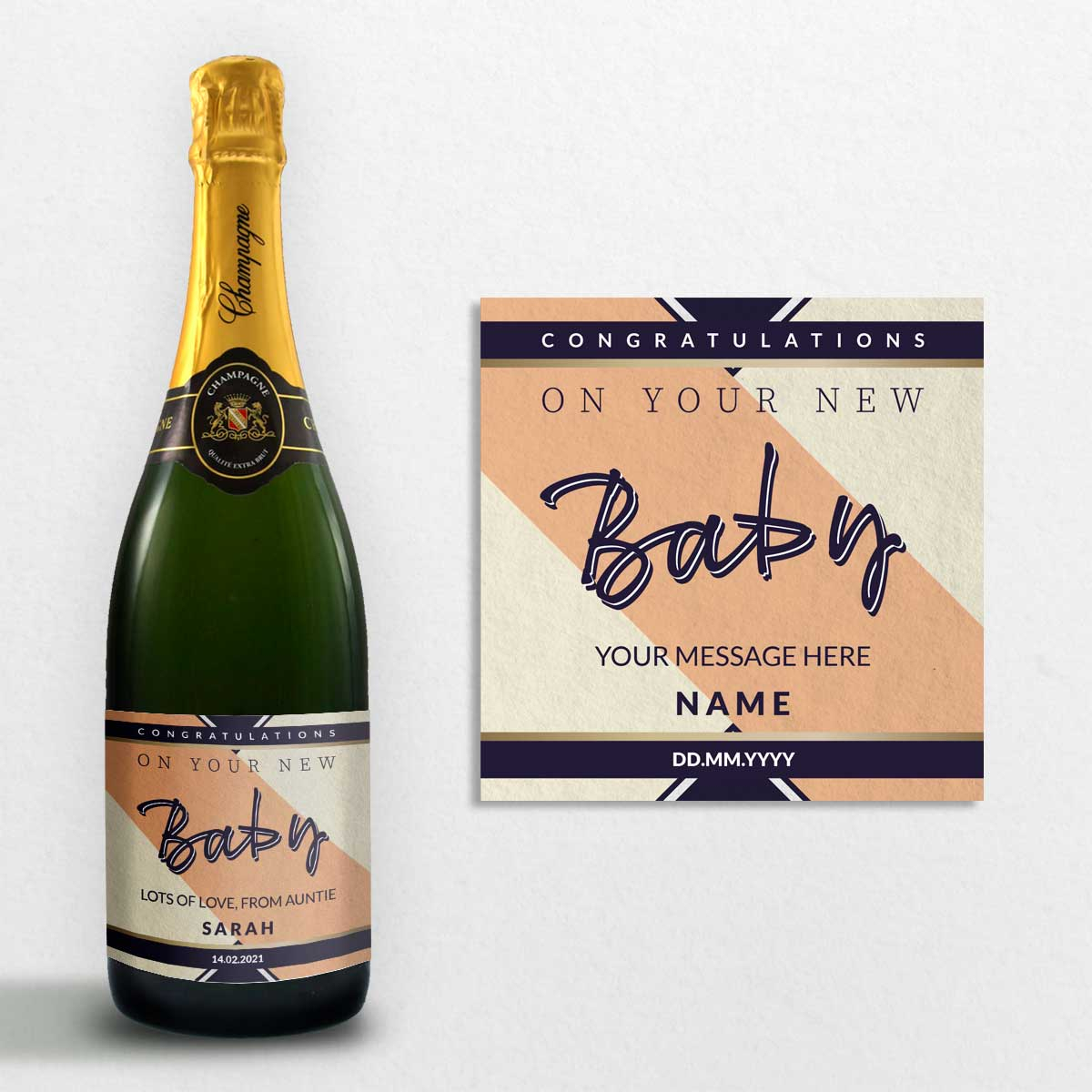 This novel bottle of personalised Champagne is truly a great gift to celebrate the birth of a new baby. Simply complete the details and we'll have the champagne label custom printed with your personalised details.
