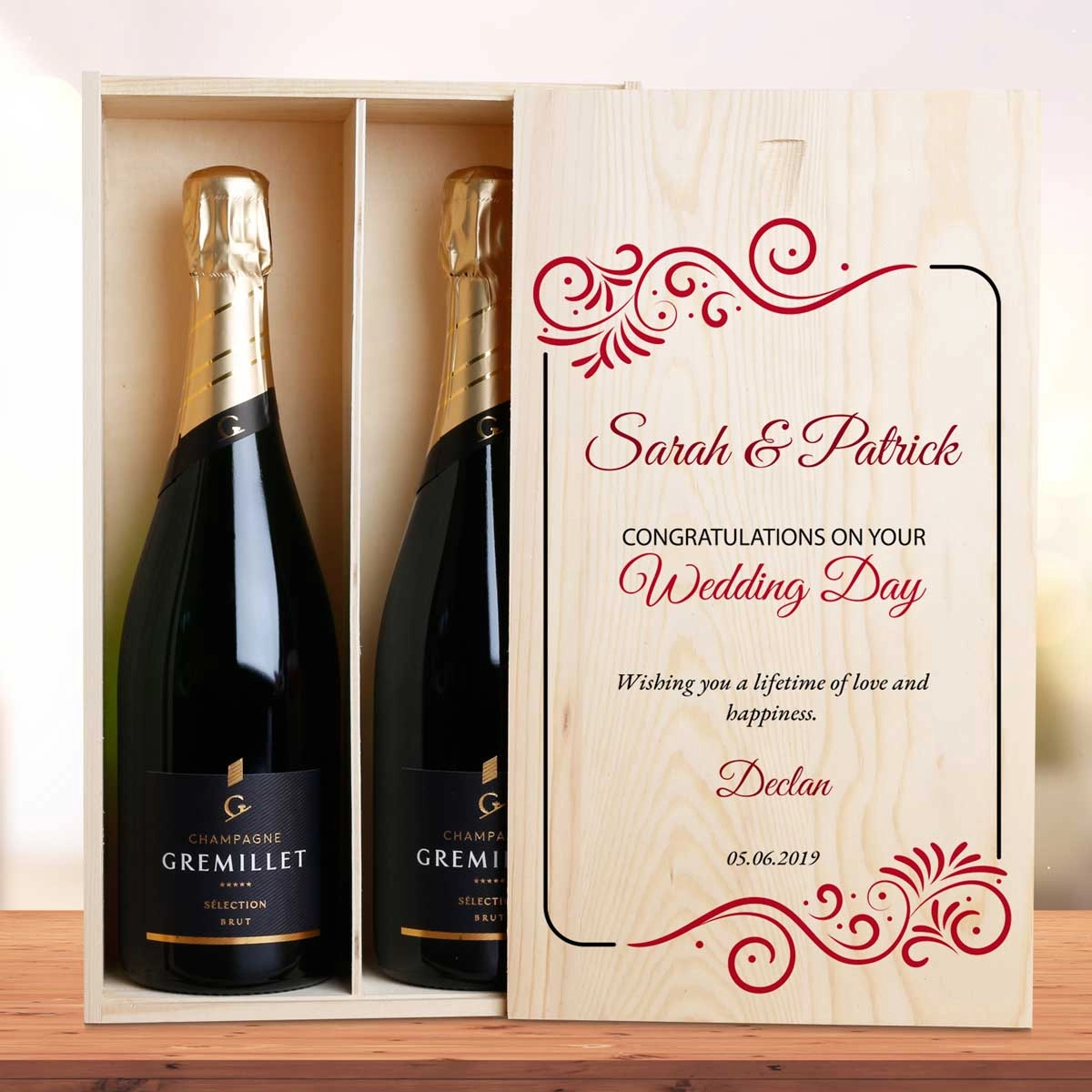 This personalised wooden box with two bottles of Champagne makes the perfect Wedding gift. One bottle to be enjoyed at Wedding's Day, one bottle for your first anniversary.