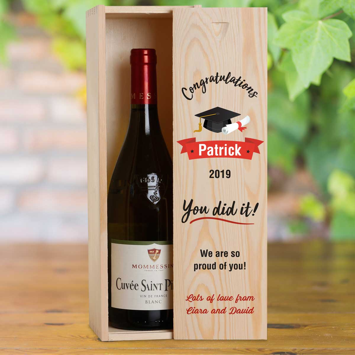 This personalised wine box with a bottle of wine makes a great gift for any Graduation.
