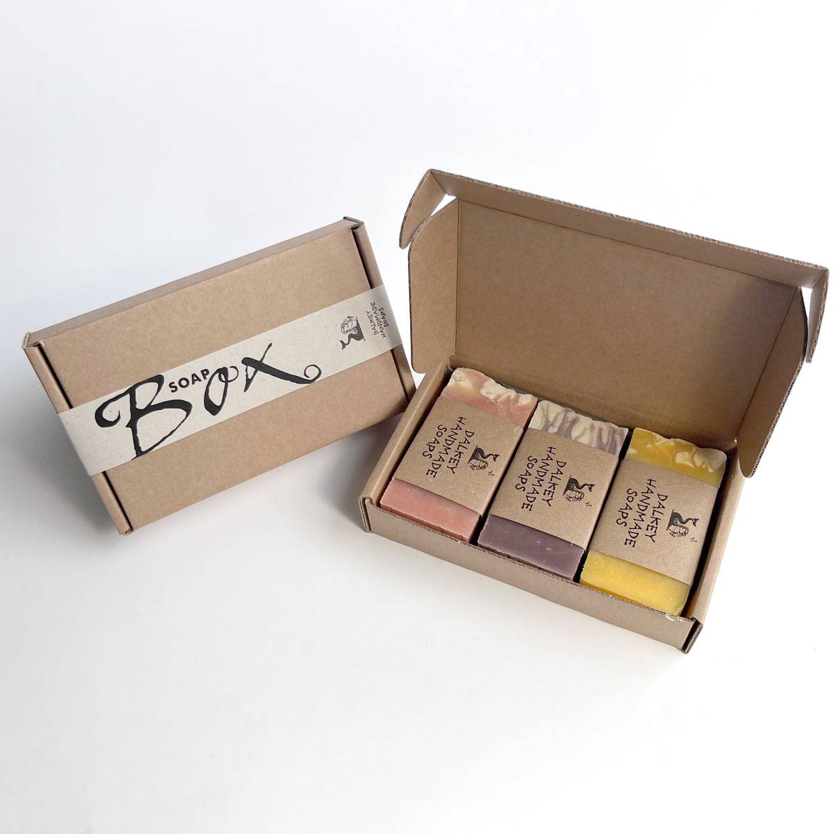A selection of 3 bars of our beautiful artisan soaps, presented in a natural craft gift box.