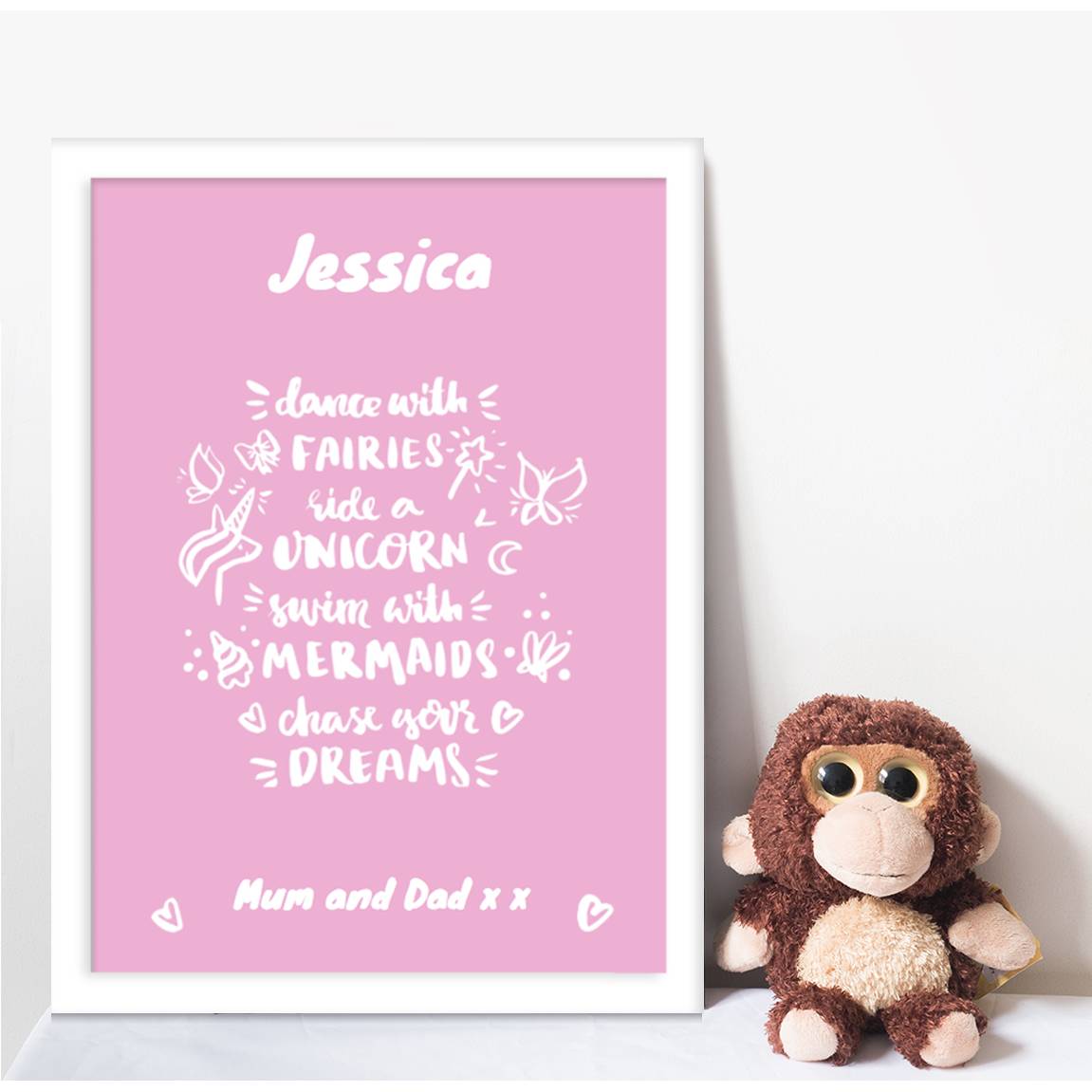 The personalised vibrant print is then presented in a wooden frame (Black or White) with a clear perspex cover.