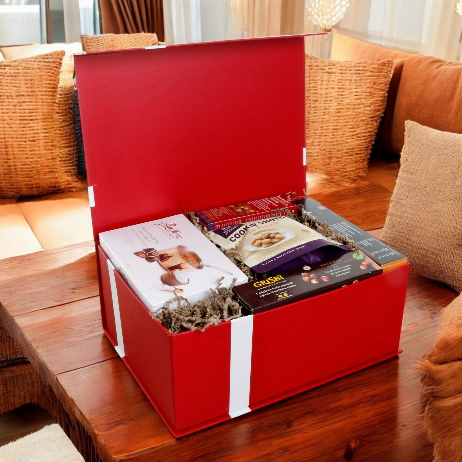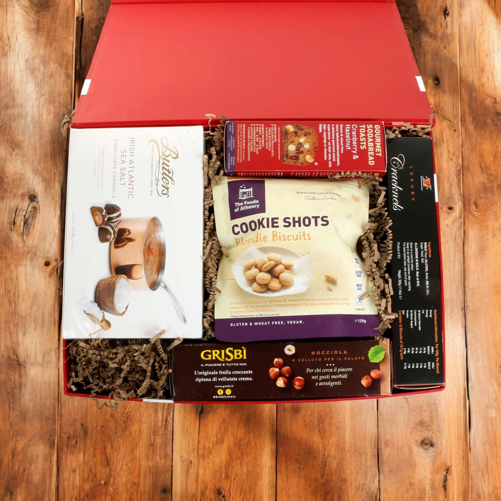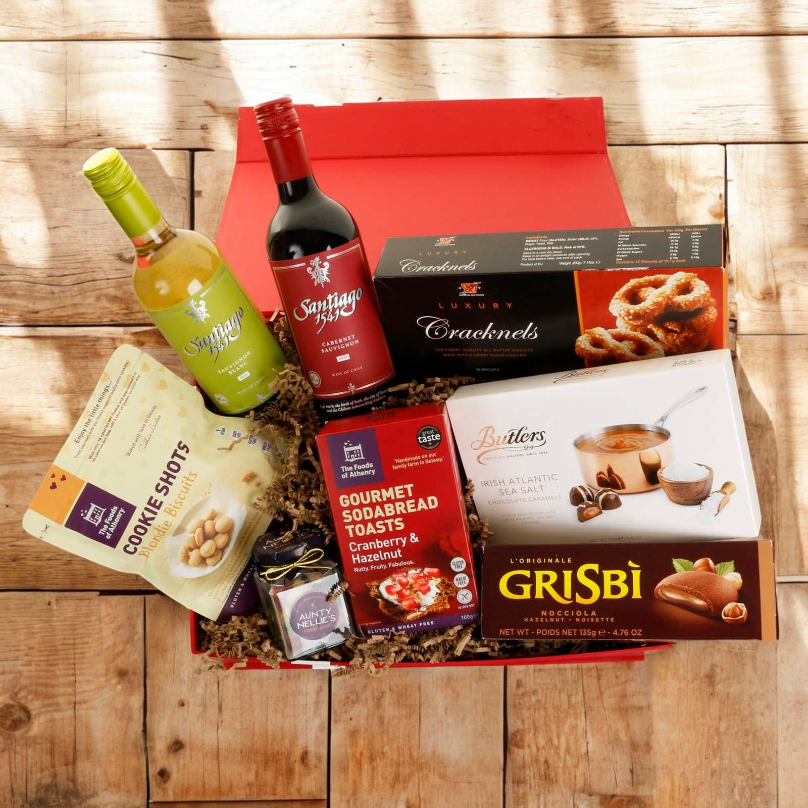 The hamper is presented in our new luxury red gift box with satin bow. Stylish and reusable, the gift box is packed inside a separate shipping box for secure transport.
