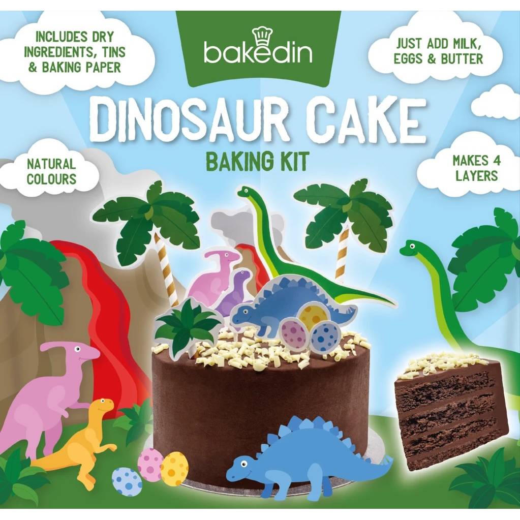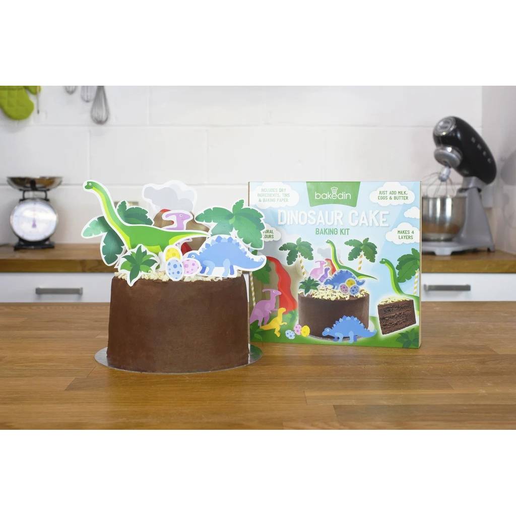 The Dinosaur Cake kit comes with all the dry ingredients perfectly weighed out, disposable baking tins and baking paper. All you need to add is eggs, butter and milk.