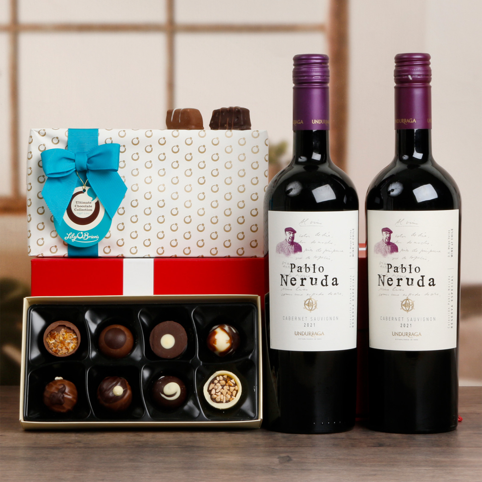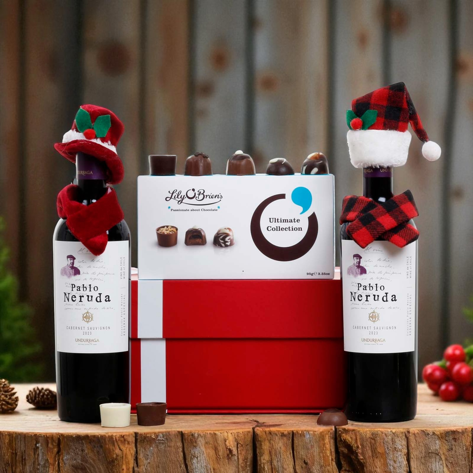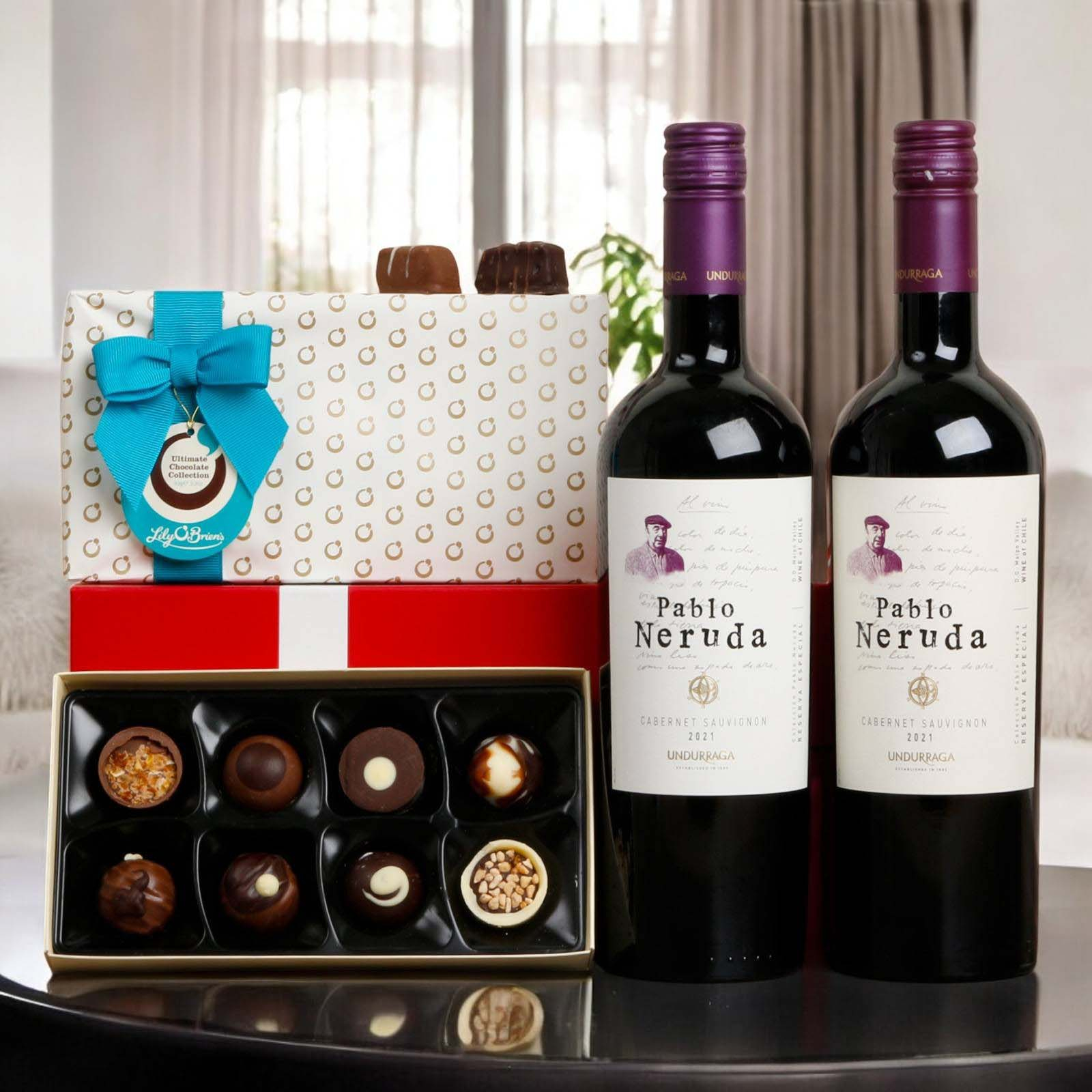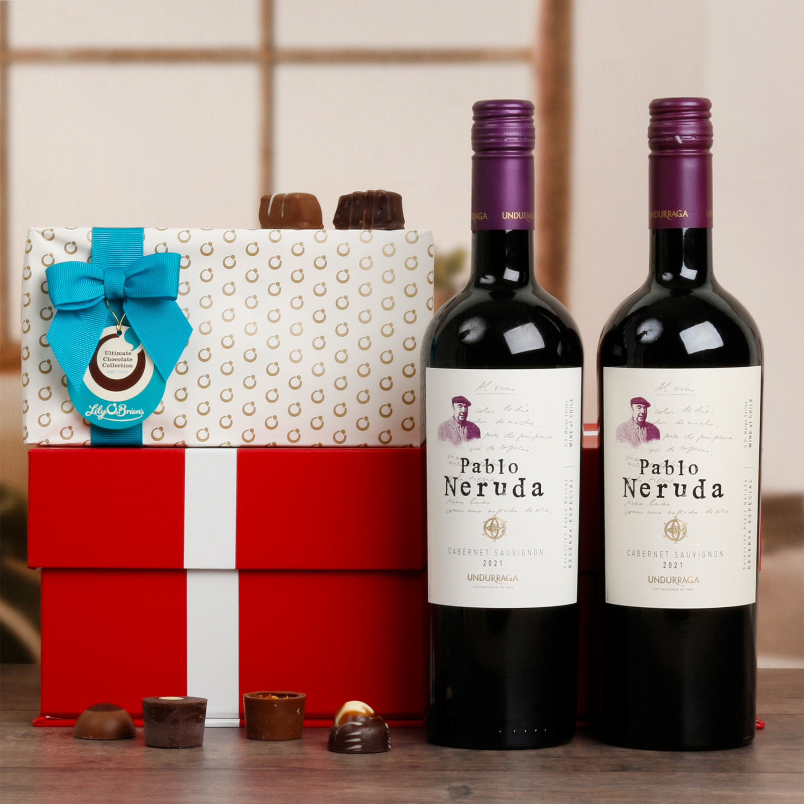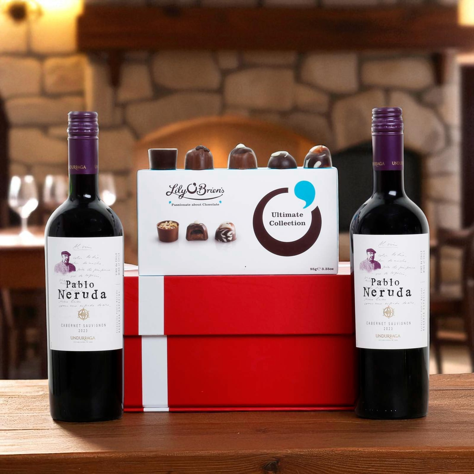 Two amazing wines coupled with an elegant box of Lily O'Briens gift-wrapped chocolates.