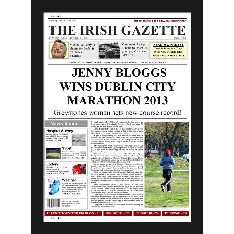 A truly novel gift, this personalised spoof newspaper cover is presented in either a tube roll or a contemporary black frame. The colourful cover comes in A3 size. You can read how the story will go underneath. To order, simply complete the personalised details and click add to cart.