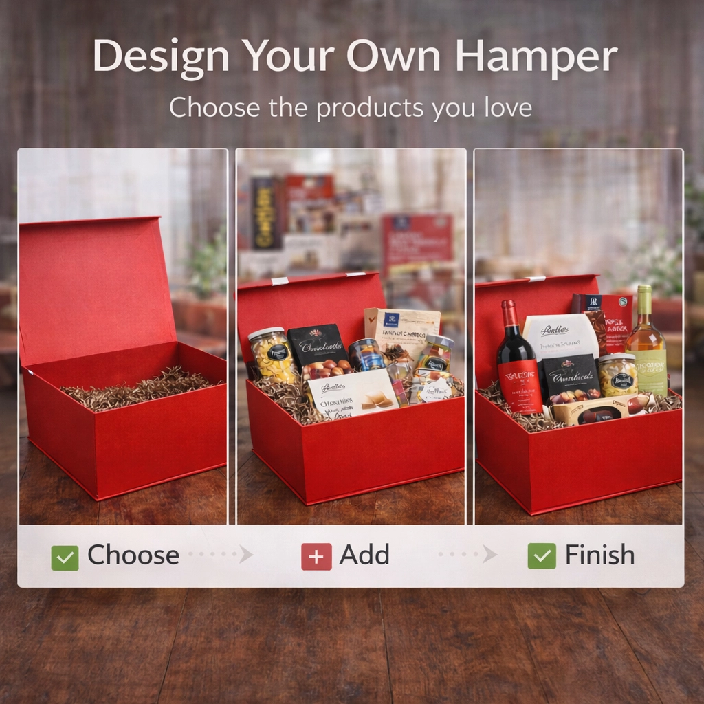 With Design Your Own Hamper, you choose exactly what goes inside. Start with an empty red gift box and hand-pick the items you want to include - from fine wines and chocolates to cakes, sweets and gourmet treats.