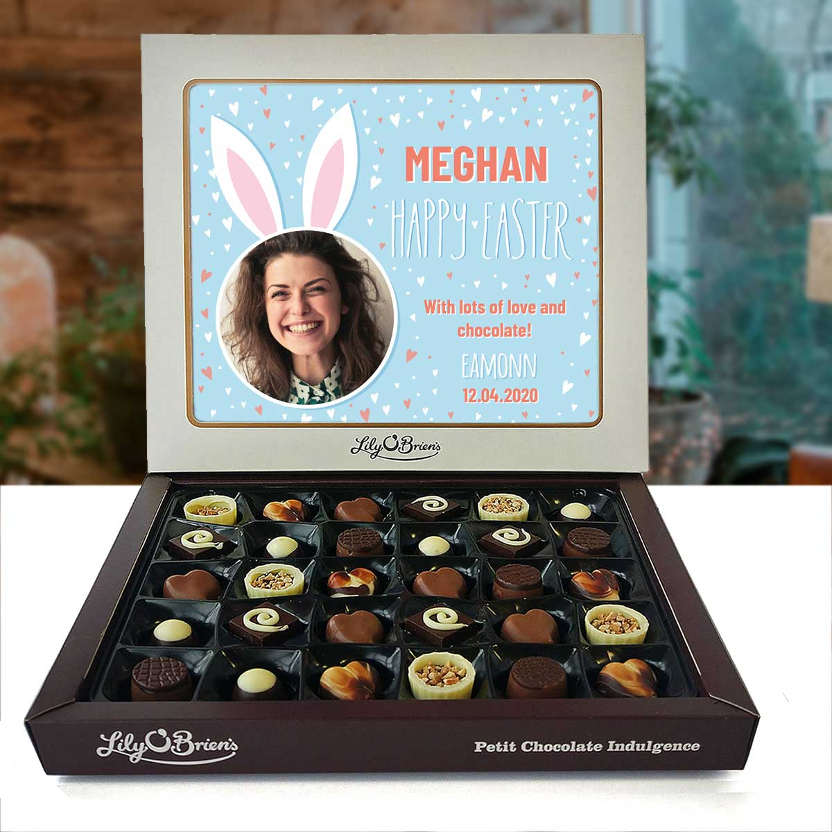 This Personalised Chocolate Box is filled with the Lily O'Brien's Luxury Chocolate collection. Approximate box dimensions: 290mm x 240mm x 40mm.