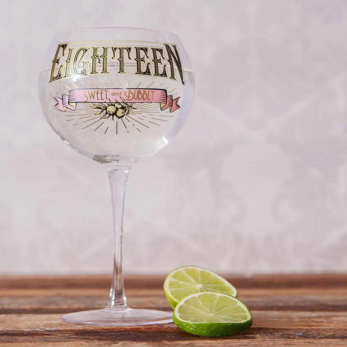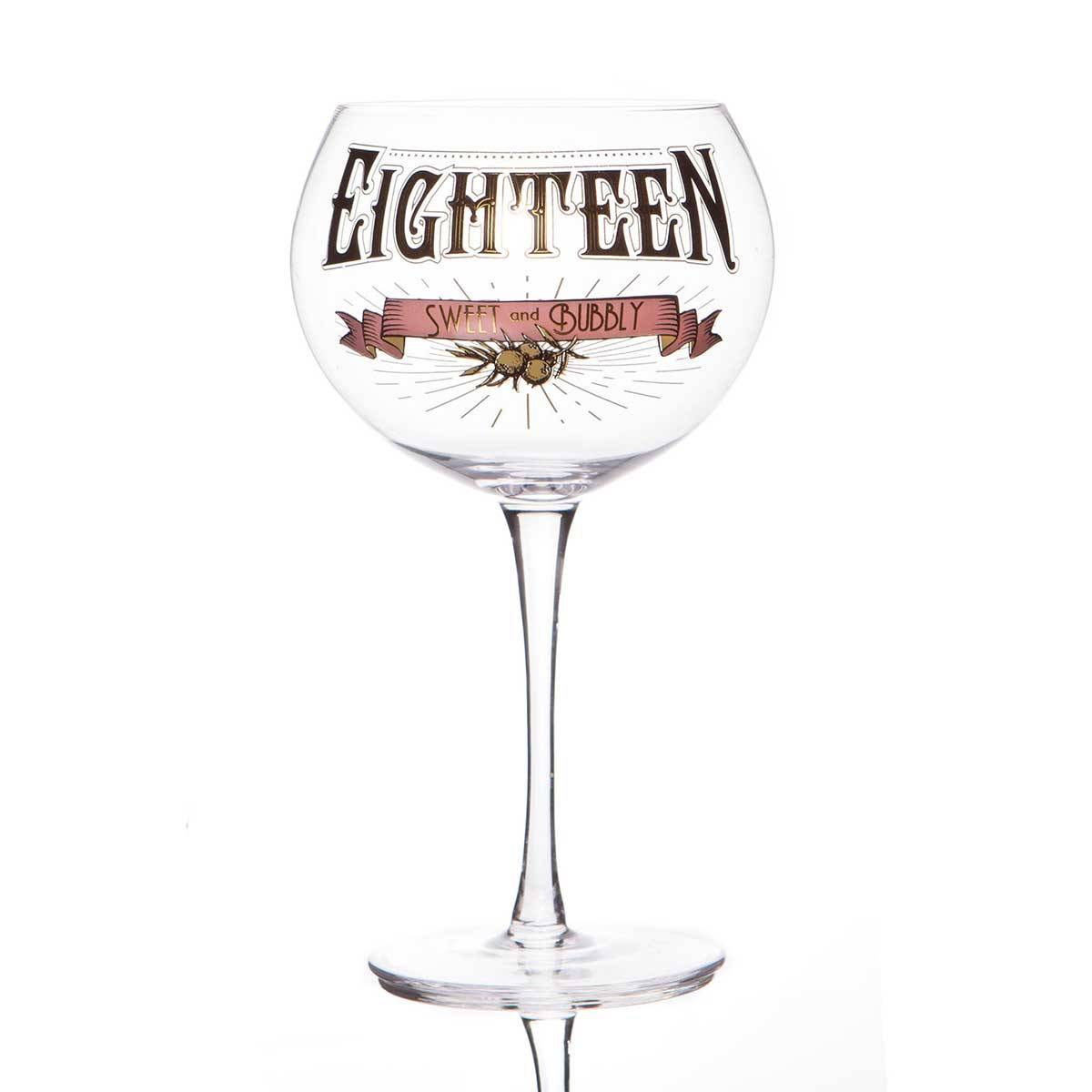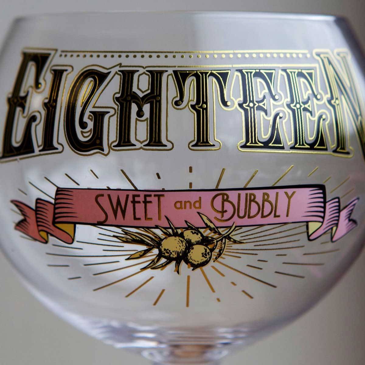 Celebrate a special 18th birthday in style with this gorgeous decorative gin glass. This glitzy glass is decorated with beautiful text that reads "Eighteen - Sweet and Bubbly" and glamorous print detail in black, gold, pink and ivory. Packaged in a stylish gift box, this prohibition style glass makes the perfect gift for a young, sweet and bubbly gin fanatic on their birthday.