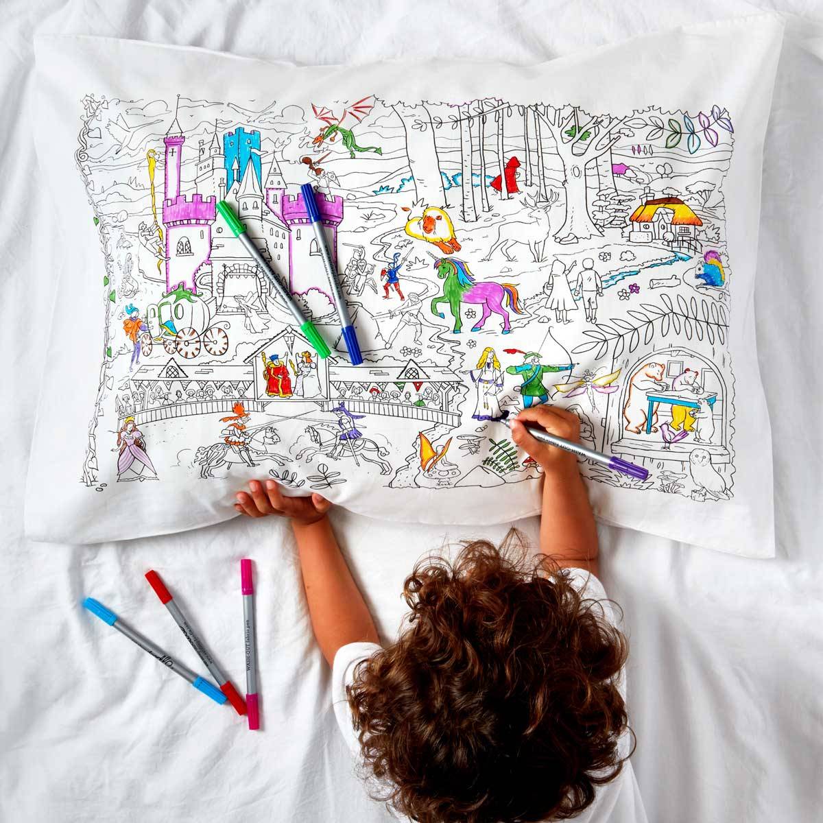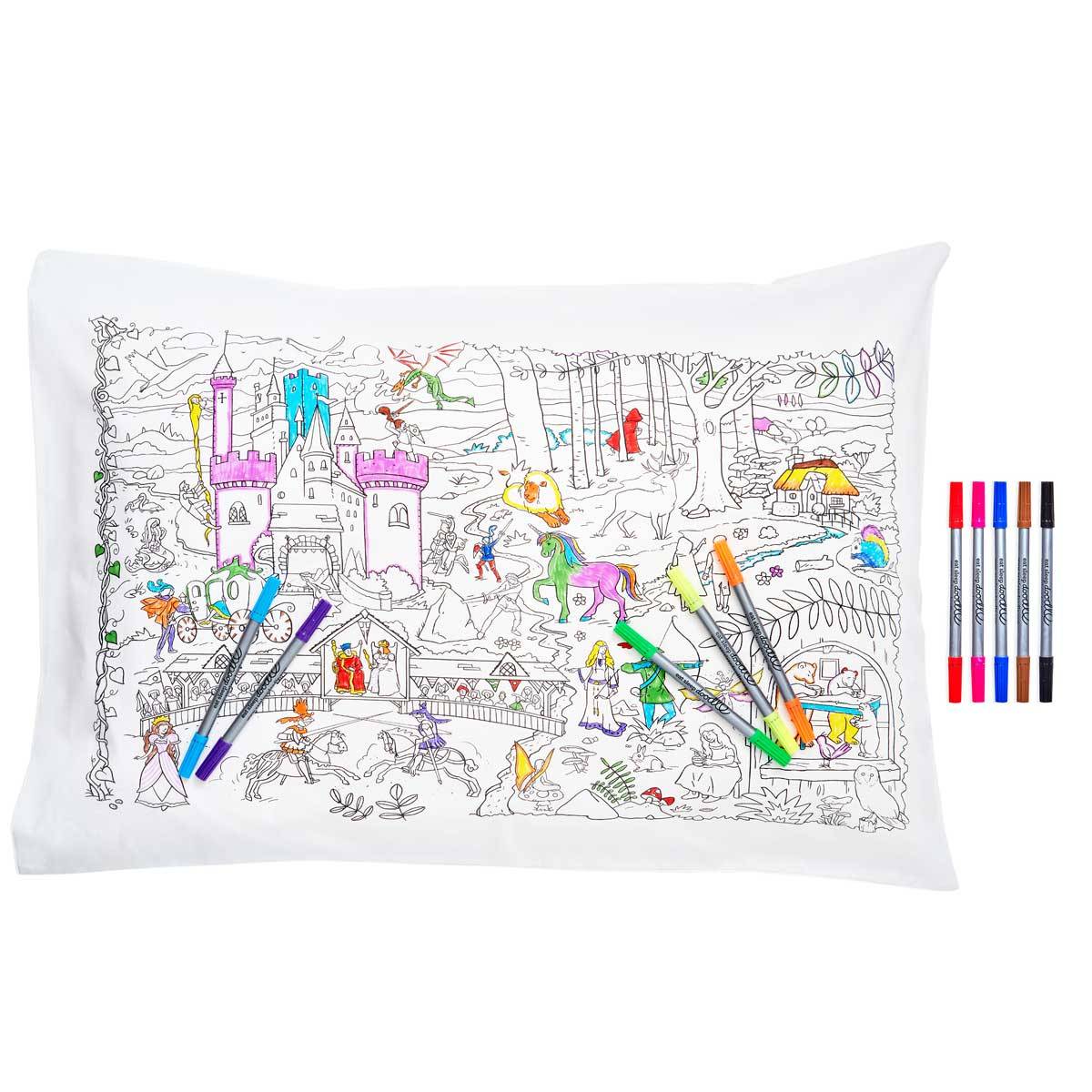 Fun colour-in fairytales and legends pillowcase filled with all your favorite storybook characters, knights, princesses, dragons, mermaids, magical unicorns and more...