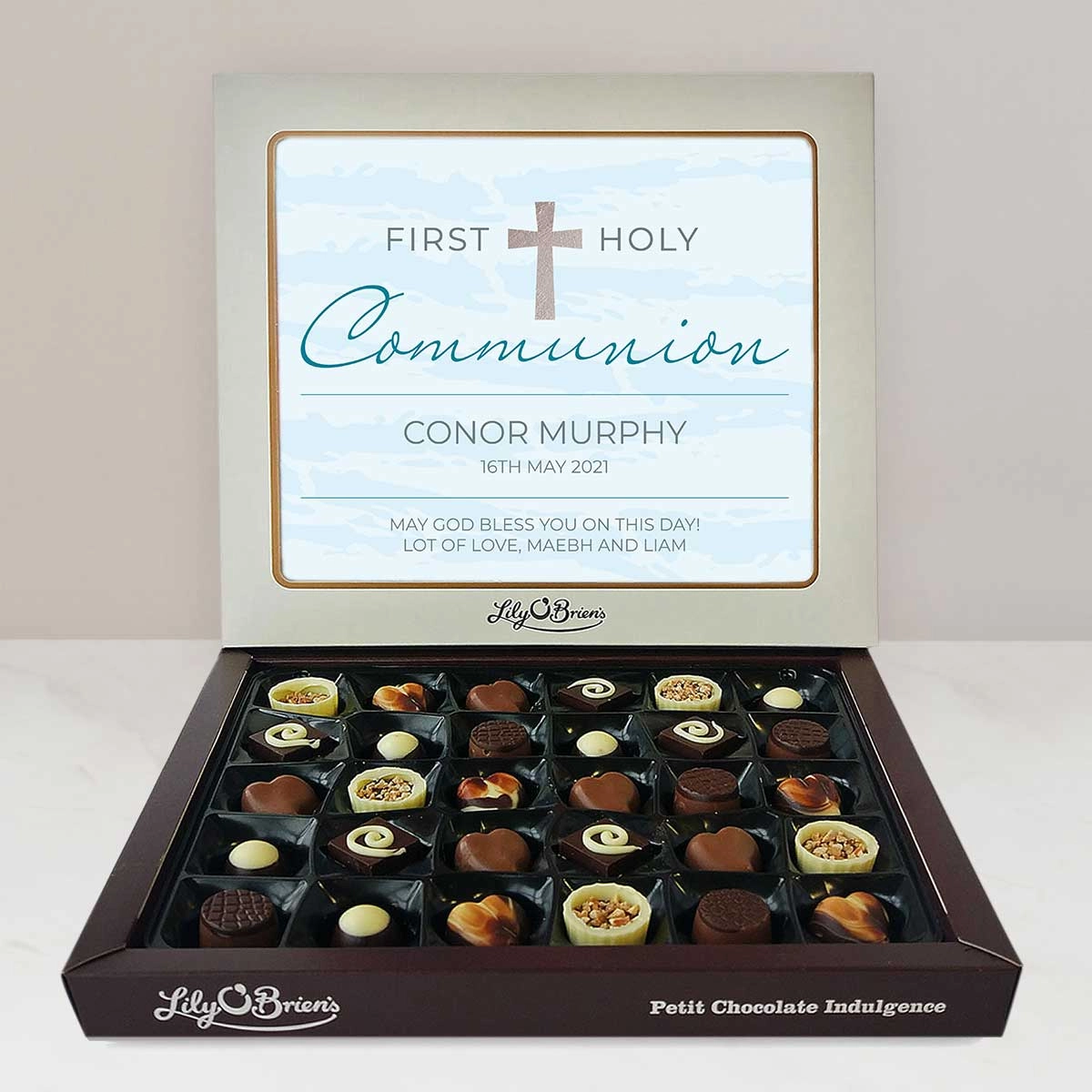 This Personalised Chocolate Box is filled with the Lily O'Brien's Luxury Chocolate collection. Approximate box dimensions: 290mm x 240mm x 40mm.