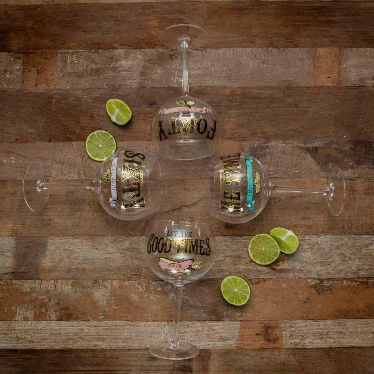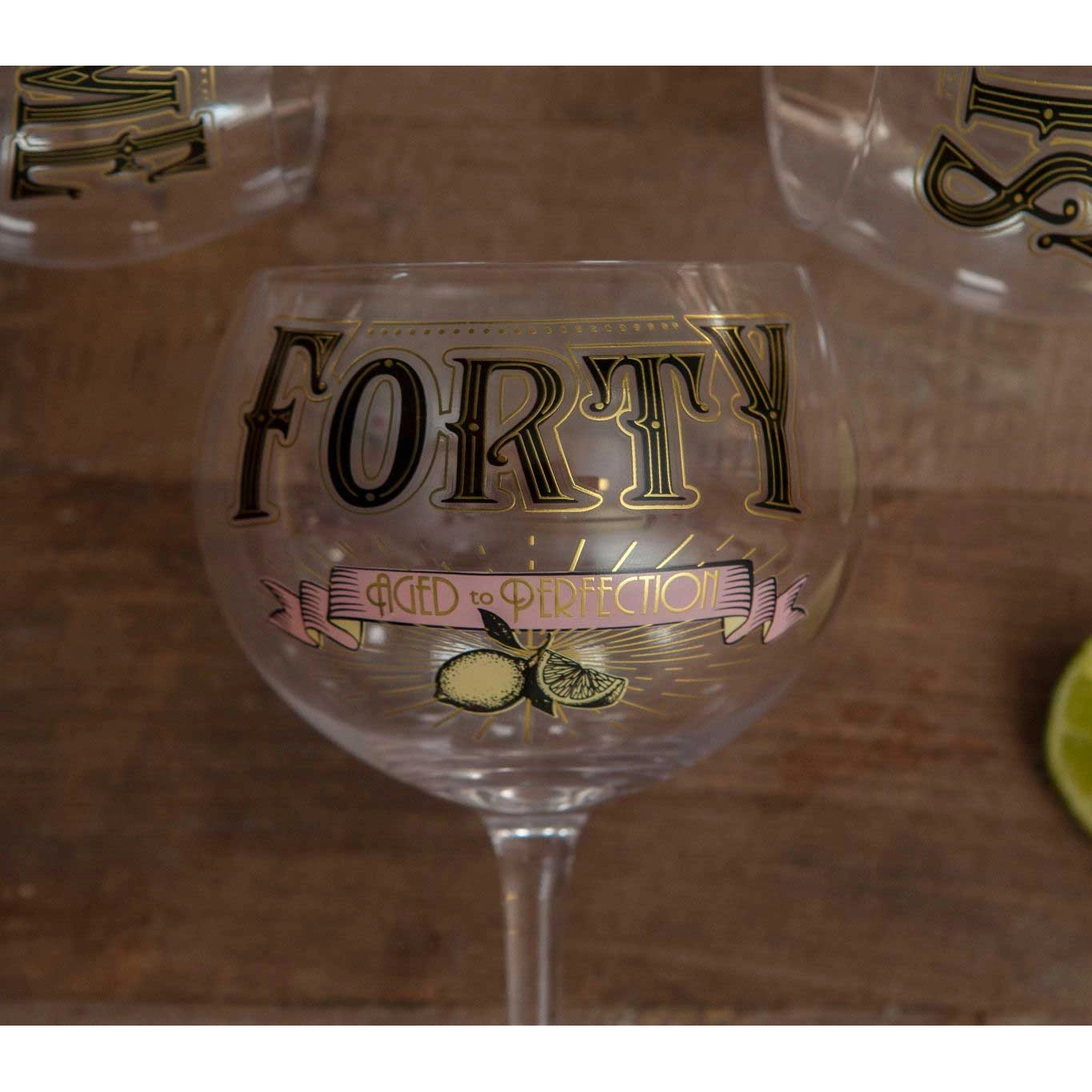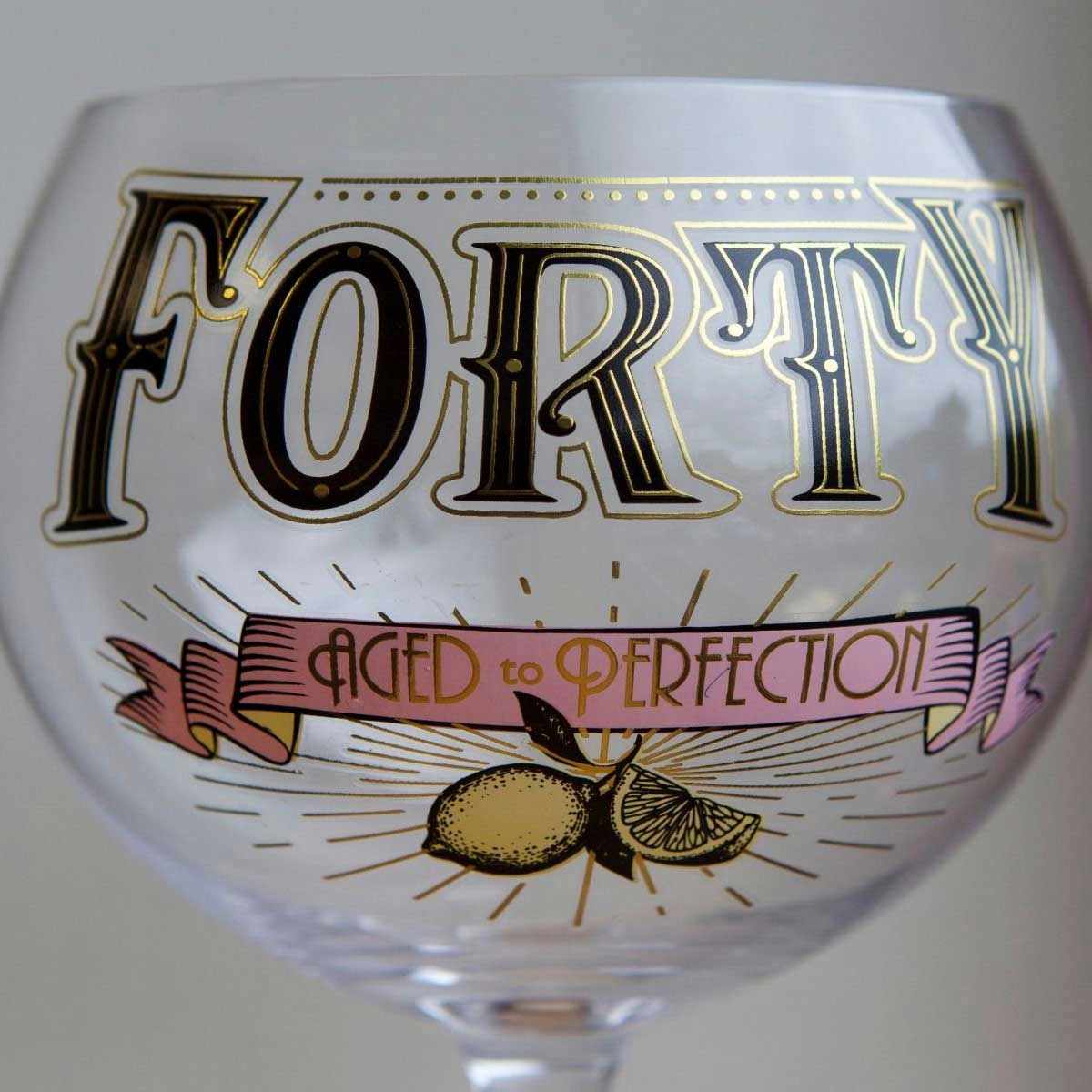 Celebrate a special 40th birthday in style with this gorgeous decorative gin glass. This glitzy glass is decorated with beautiful text that reads "Forty – Aged to Perfection" and glamorous print detail in black, gold, pink and ivory. Packaged in a stylish gift box, this prohibition style glass makes the perfect gift for a perfectly aged gin fanatic on their fortieth birthday.