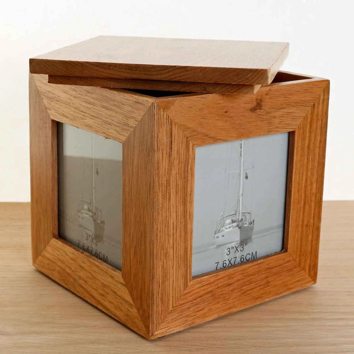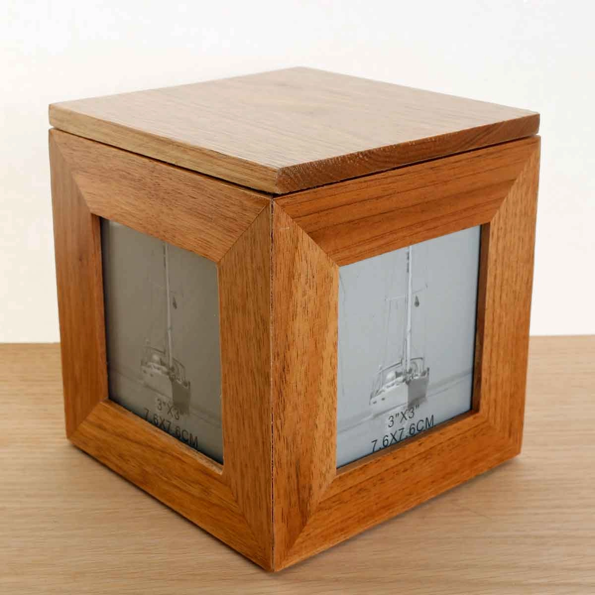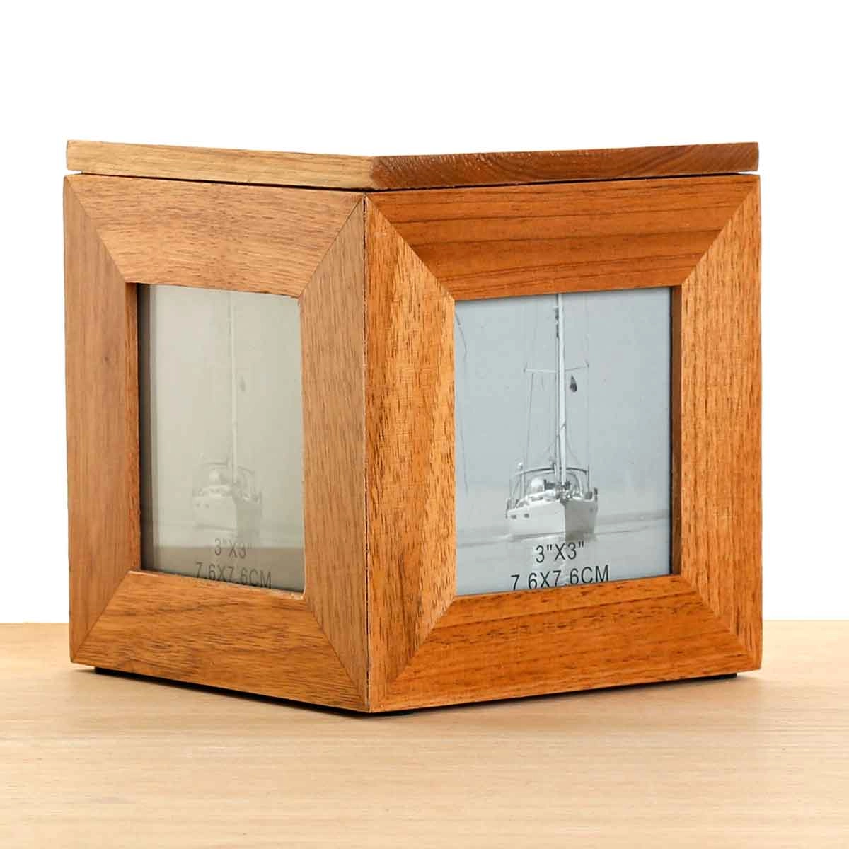 Each side has a slot for a 3" x 3" photograph.