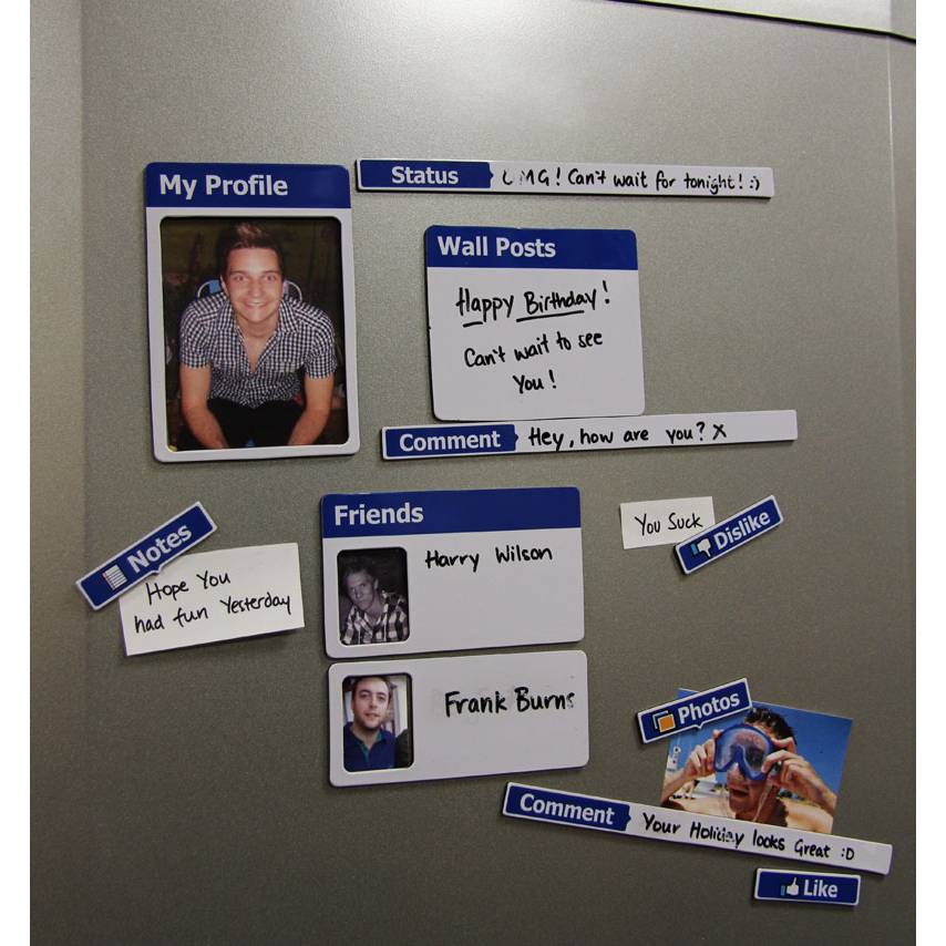 - Wipe-clean fridge magnets designed to look like a social networking homepage