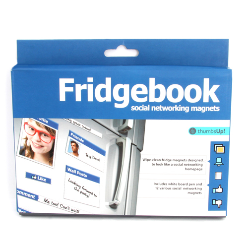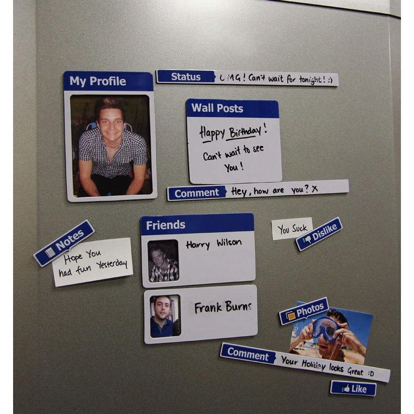 - Wipe-clean fridge magnets designed to look like a social networking homepage