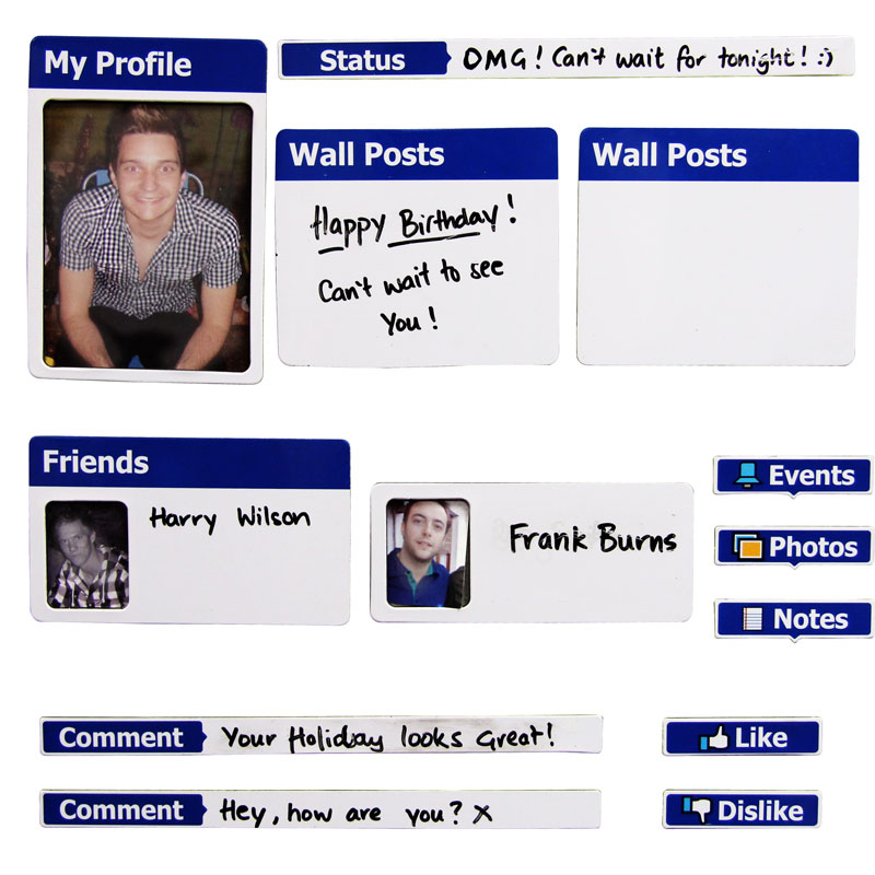 - Magnet set includes: My Profile, Status, Comment x 2, Friends, Photos, Events, Notes, Like, Dislike, Wall Posts x 2