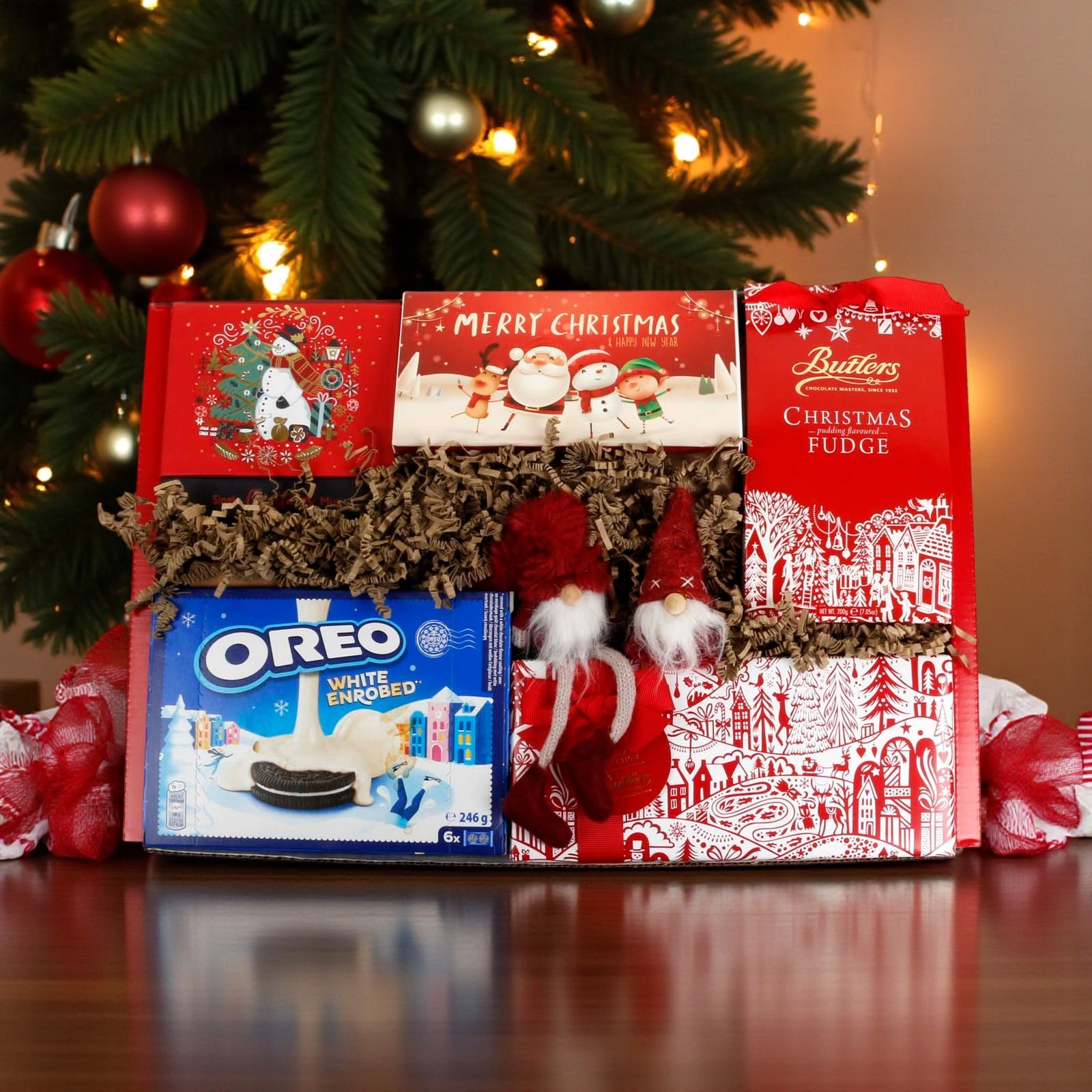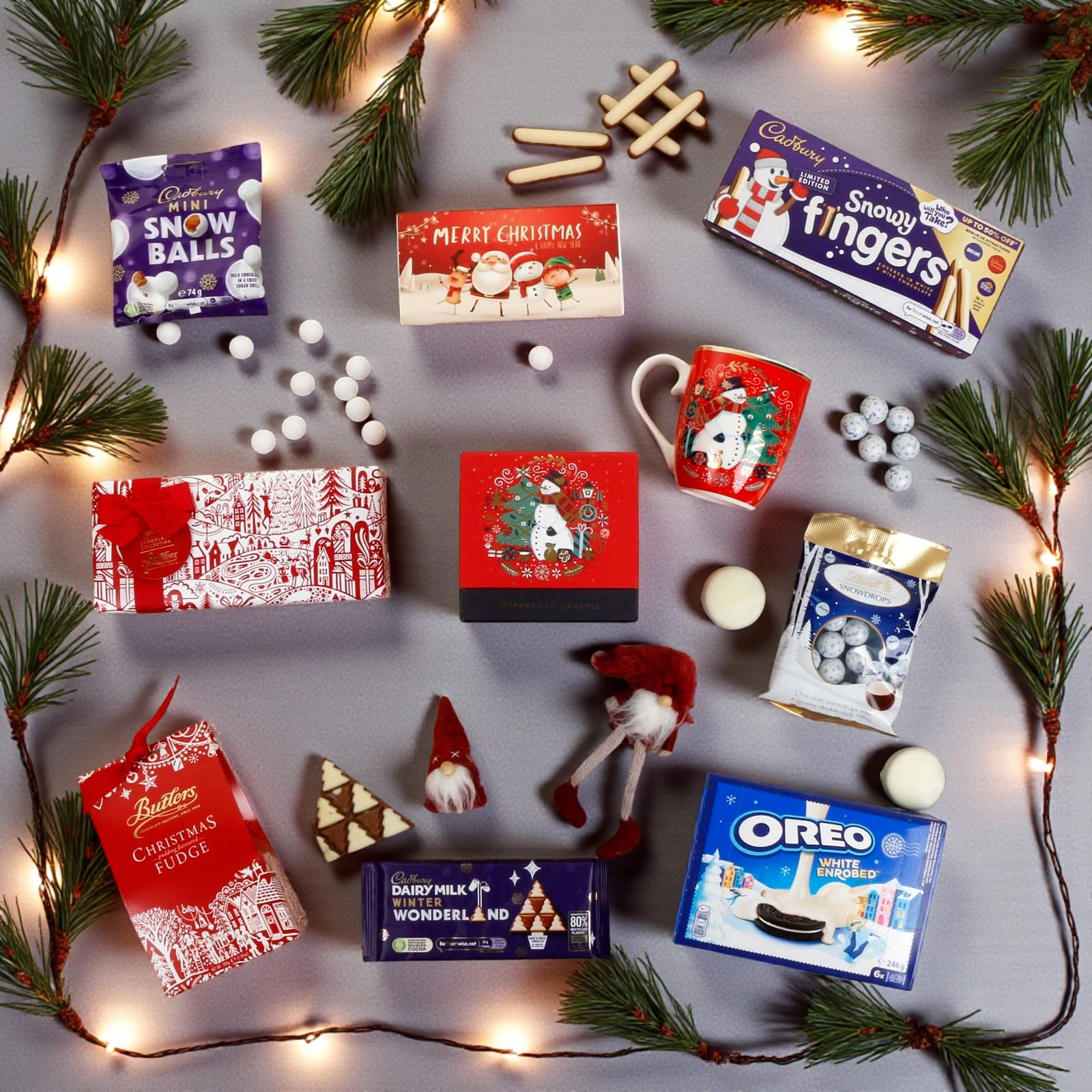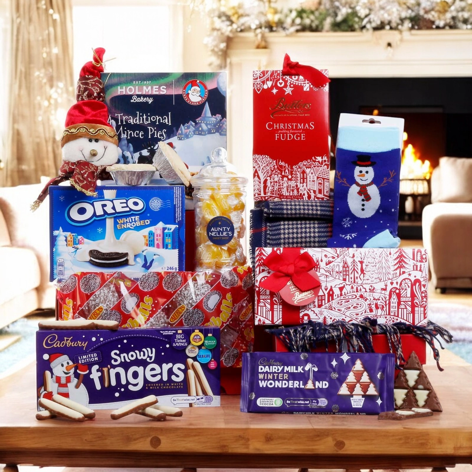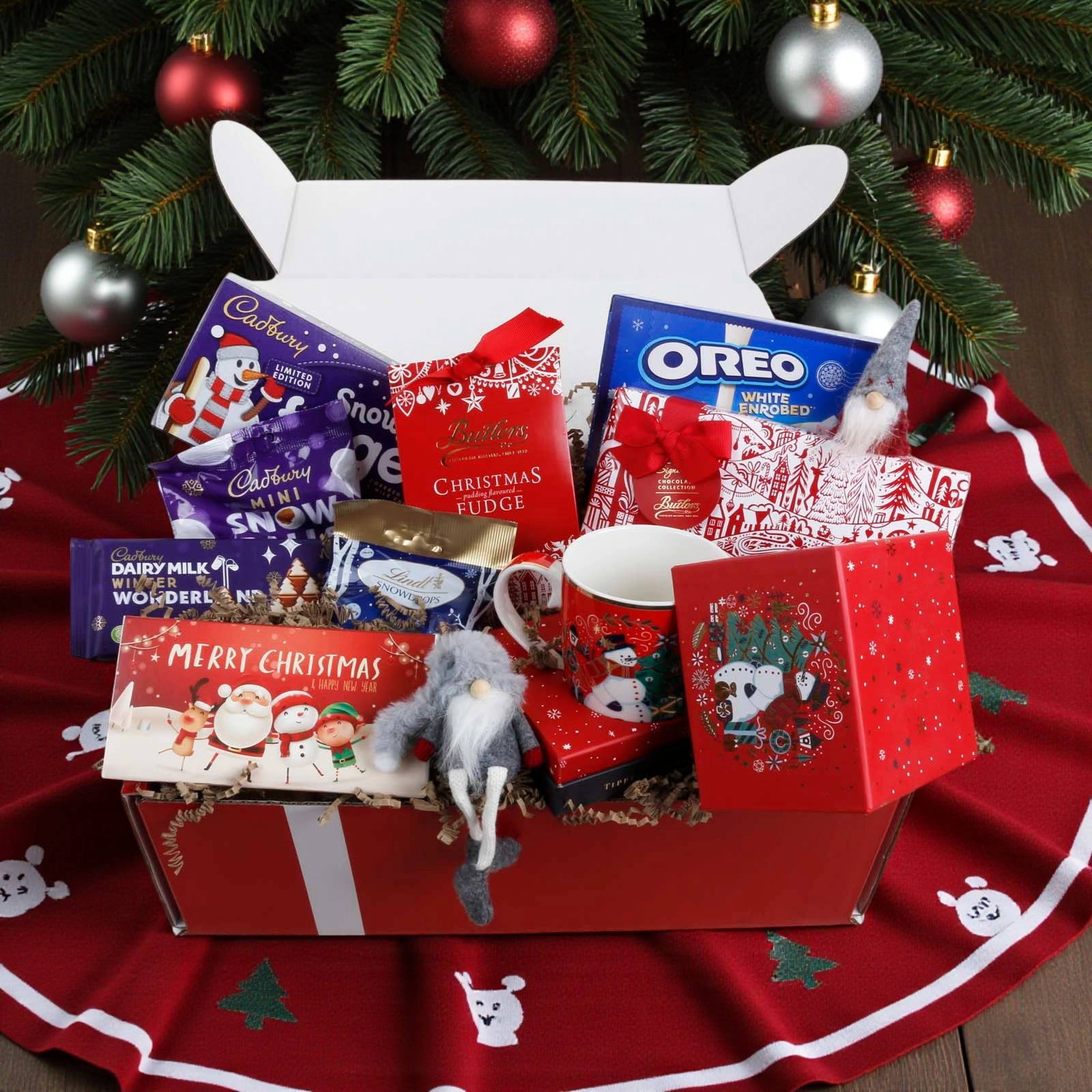 • Festive Variety: A delicious mix of chocolates, fudge, biscuits and a festive mug, presented with charming Christmas decorations.
