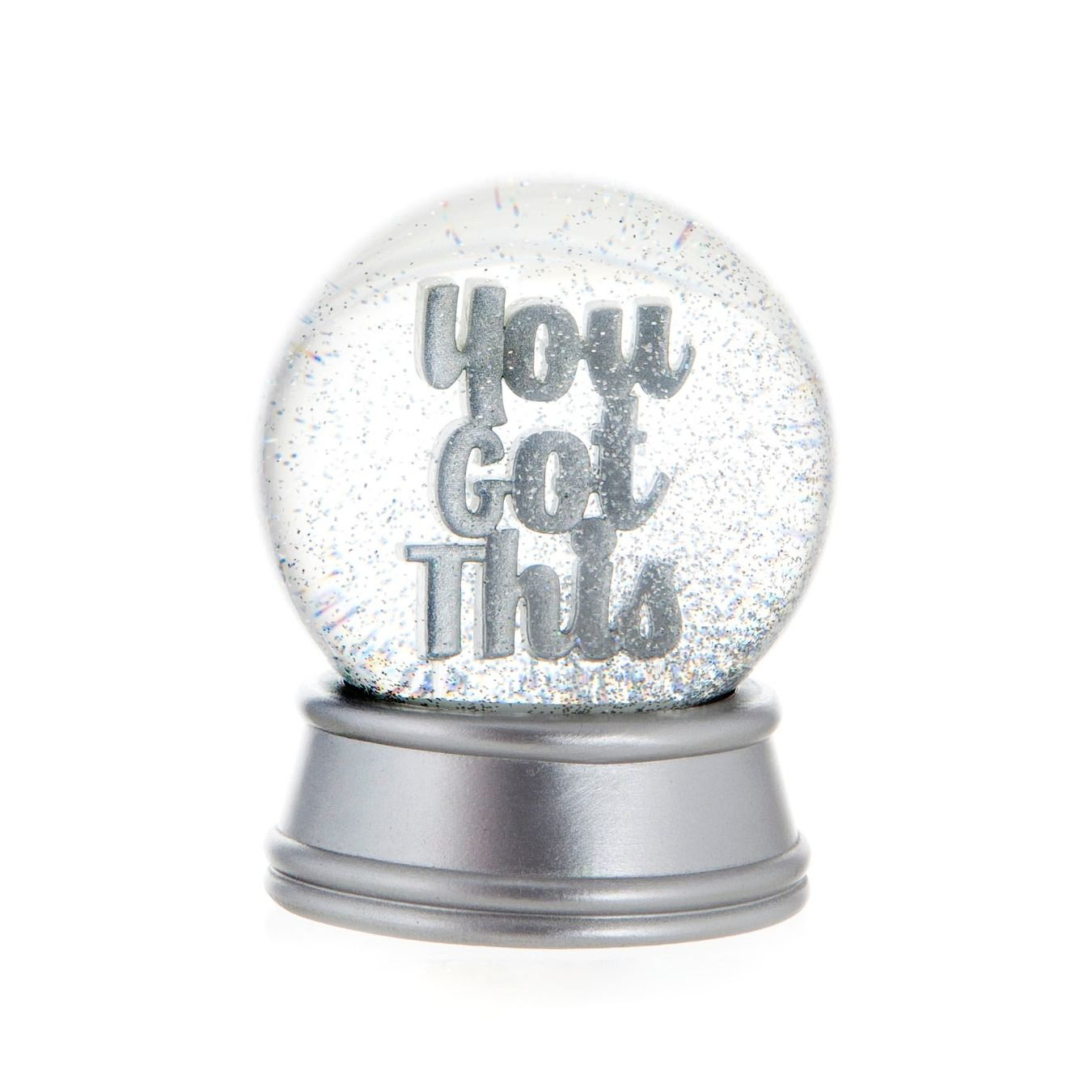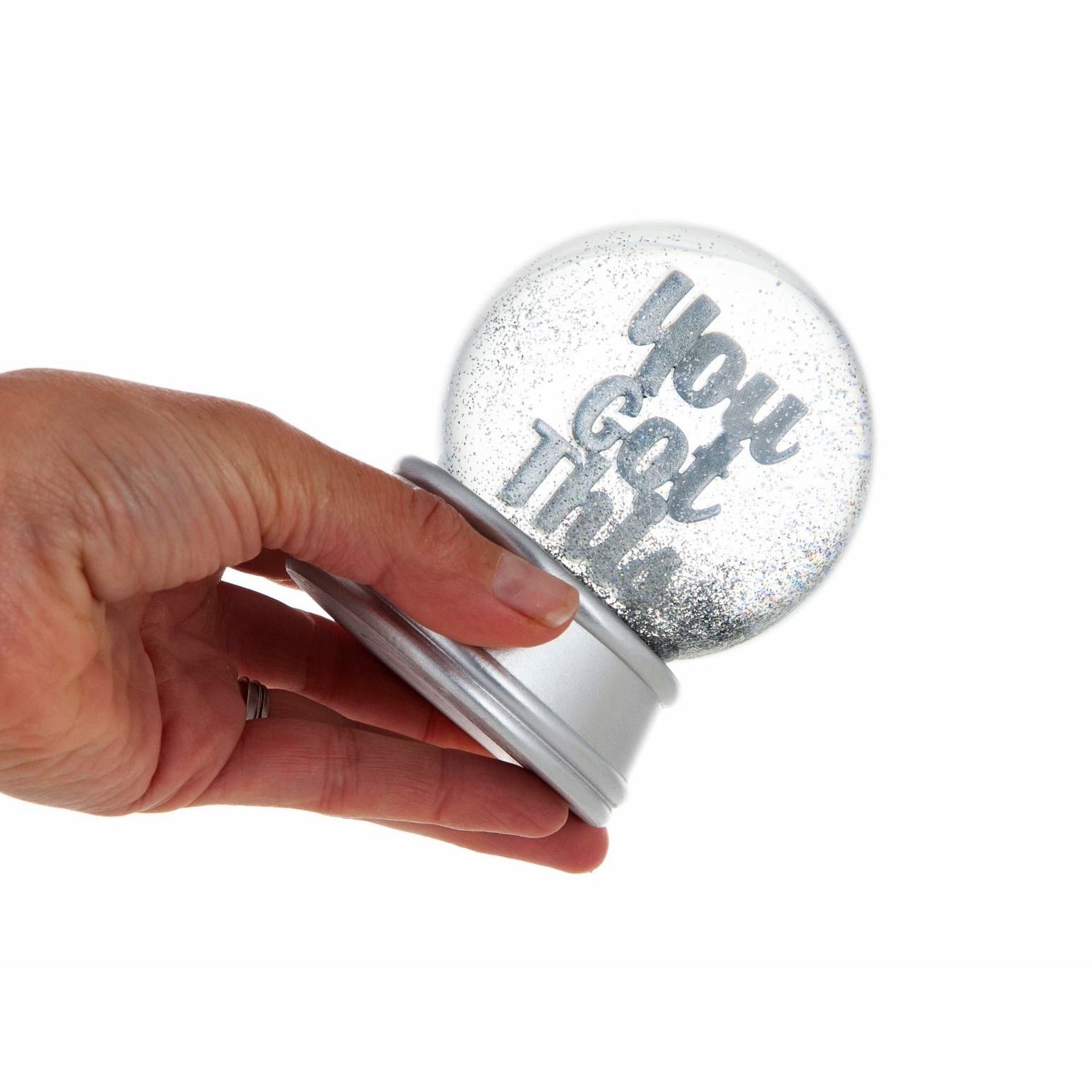 Show off your sparkle and let the world know that "you got this" with this glamorous shining snow globe! With intricate silver text that reads "You Got This", and twinkling silver glitter, this glass and resin ornament sits beautifully in any room of the home or as a fun decorative desk accessory in the office! Glitzy and bold, this is the perfect supportive gift for a loving friend as a pick me up, new job or university, mother’s day, or for a new mum who needs to know you care!