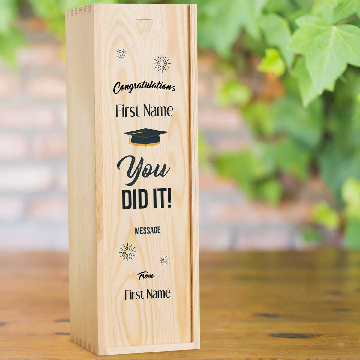 This personalised wine box with a bottle of wine makes a great gift for any Graduation.