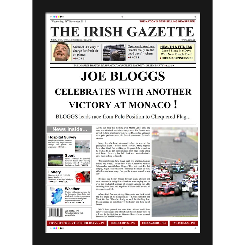 A truly novel gift, this personalised spoof newspaper cover is presented in either a tube roll or a contemporary black frame. The colourful cover comes in A3 size. You can read how the story will go underneath. To order, simply complete the personalised details and click add to cart.