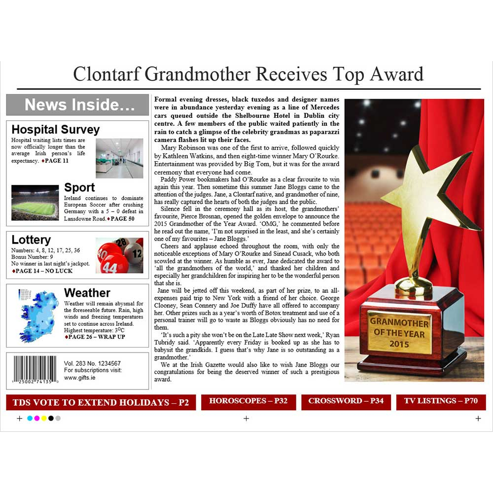 A truly novel gift, this personalised spoof newspaper cover is presented in either a tube roll or a contemporary black frame. The colourful cover comes in A3 size. You can read how the story will go underneath. To order, simply complete the personalised details and click add to cart.