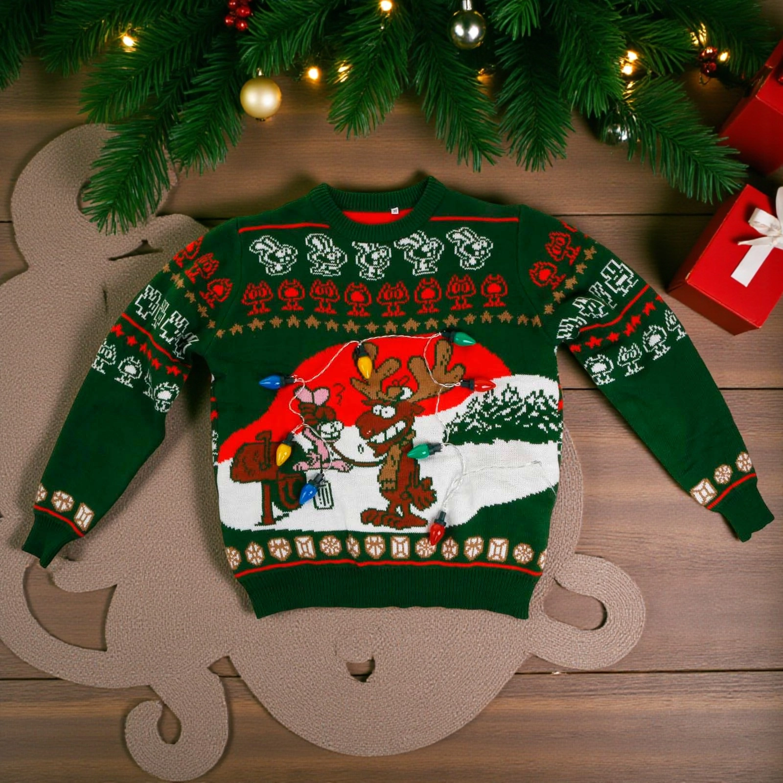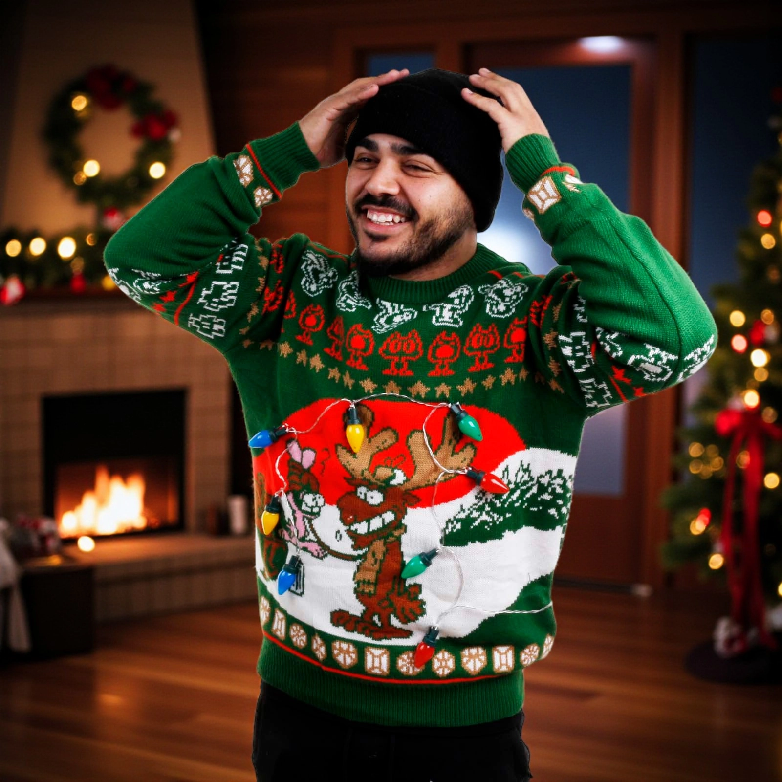 Get ready to be the life of the party and add a unique touch to your seasonal wardrobe with this Green Christmas Jumper Reindeer Novelty Light Up – the perfect gift to celebrate Christmas with laughter and light!