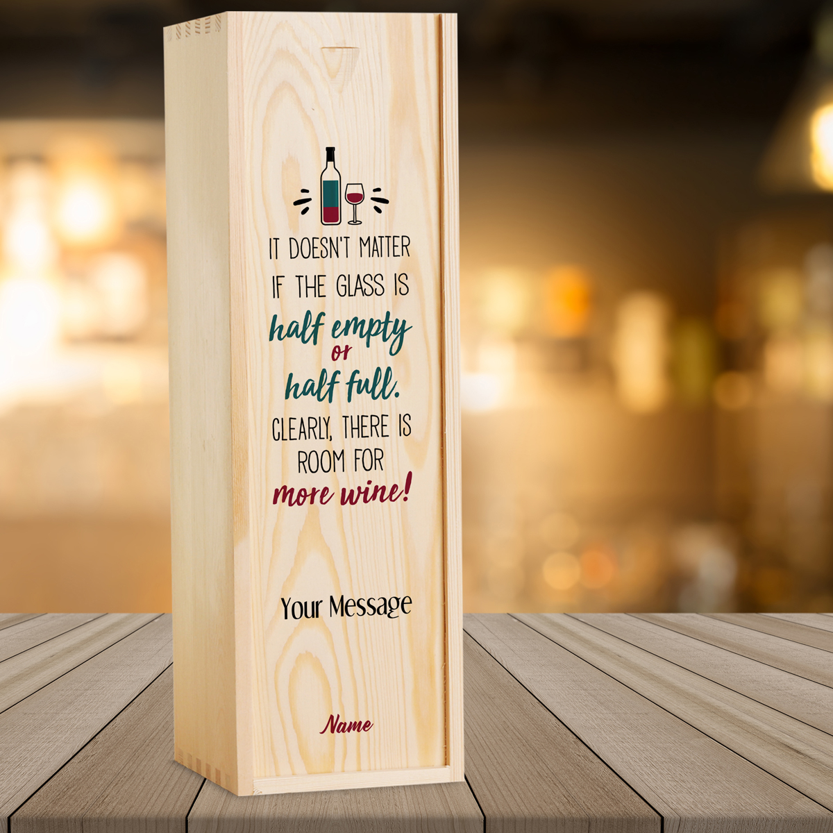 Simply type in the recipient's name, age and your message. We will professionally print directly onto the wine lid using a high resolution UV print process. The wooden wine box makes a great keepsake after the wine has been enjoyed.