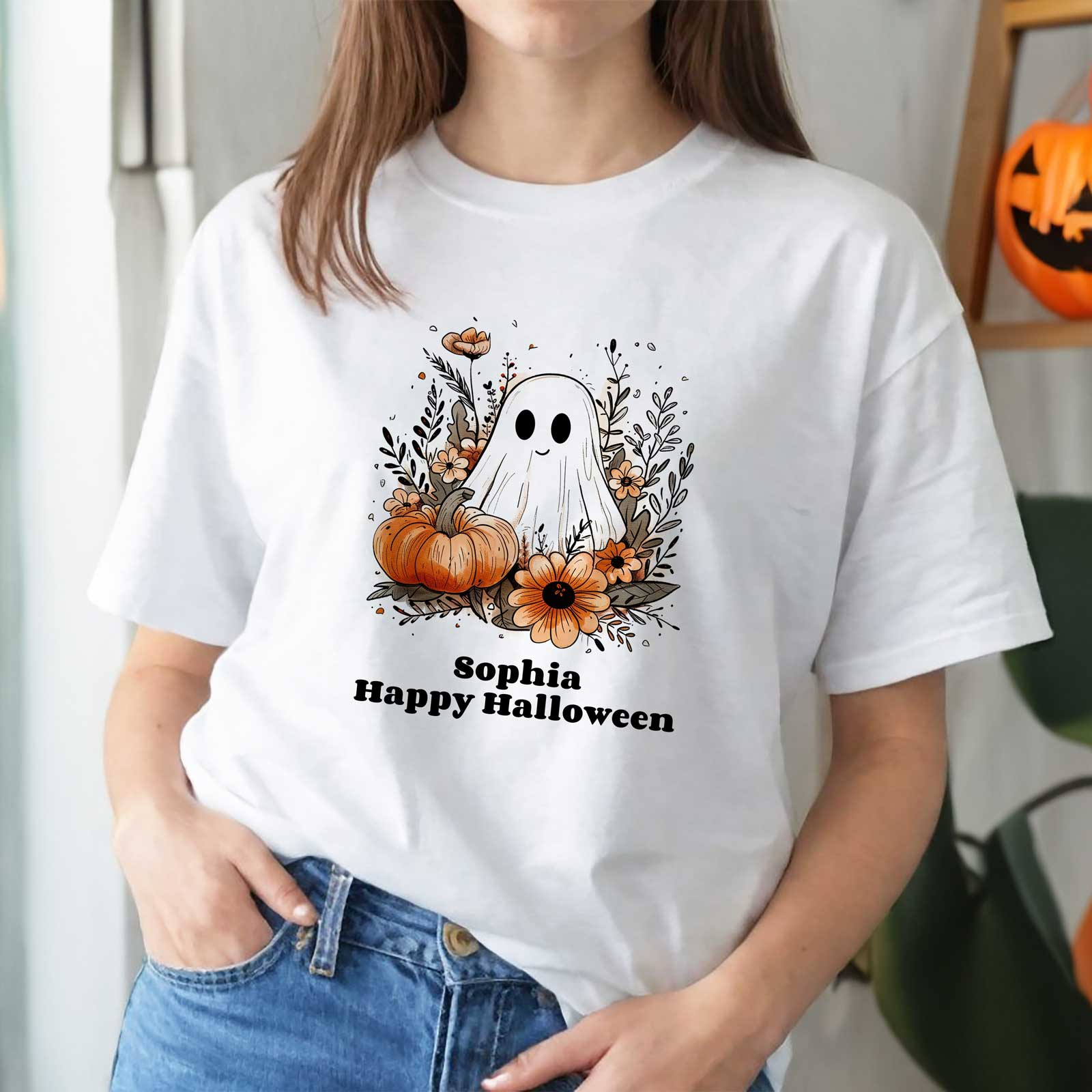 Our "Halloween, Ghost and Pumpkin – Personalised T-Shirt" is a fun and festive choice!