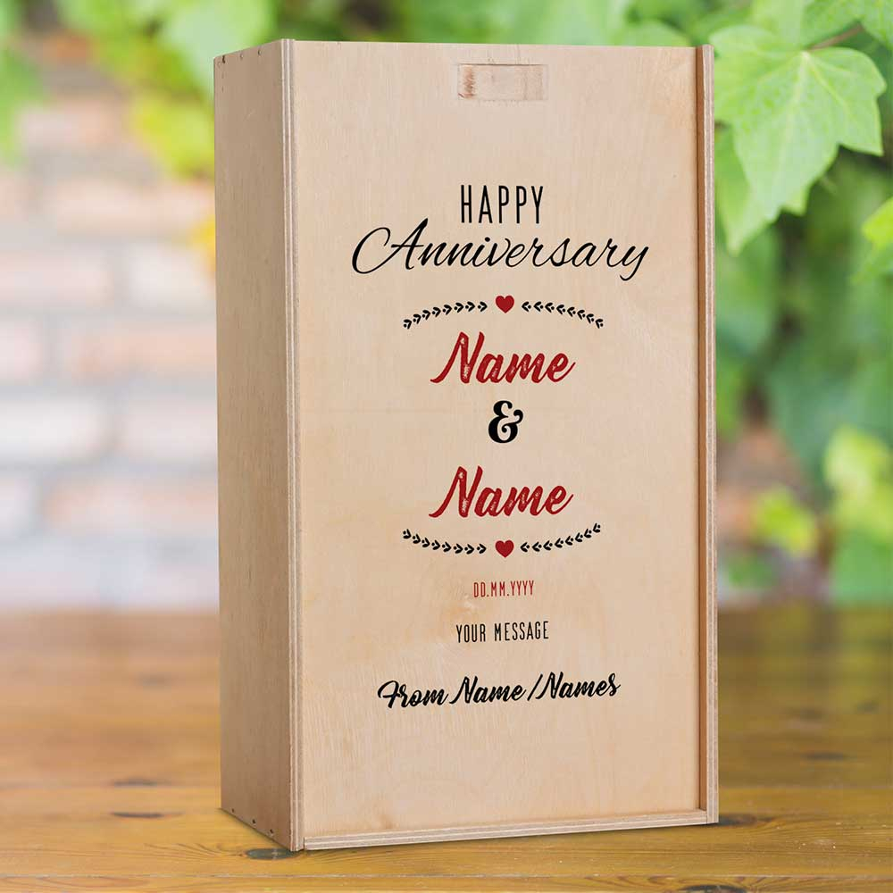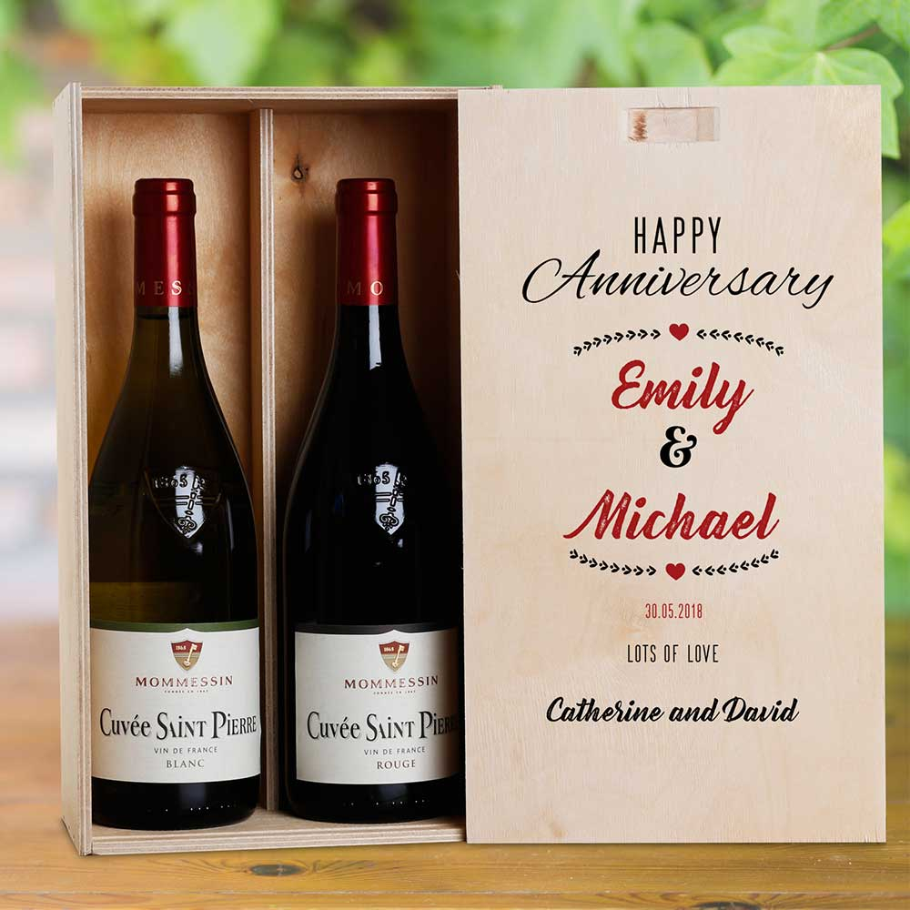 This personalised wine box with two bottles of wine makes the perfect anniversary present.