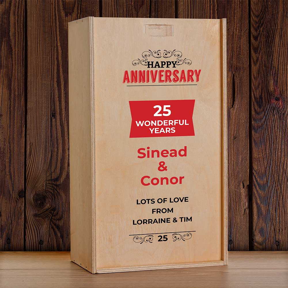This personalised wine box with two bottles of wine makes the perfect anniversary present.
