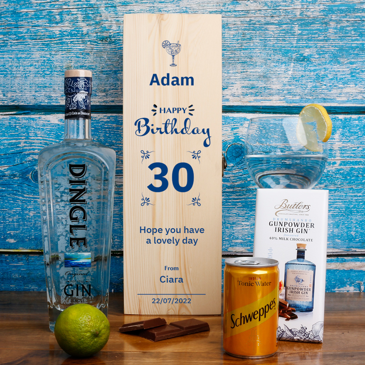 This personalised wooden box with a bottle of Dingle Irish Gin makes the perfect gift for gin lovers' Birthday.