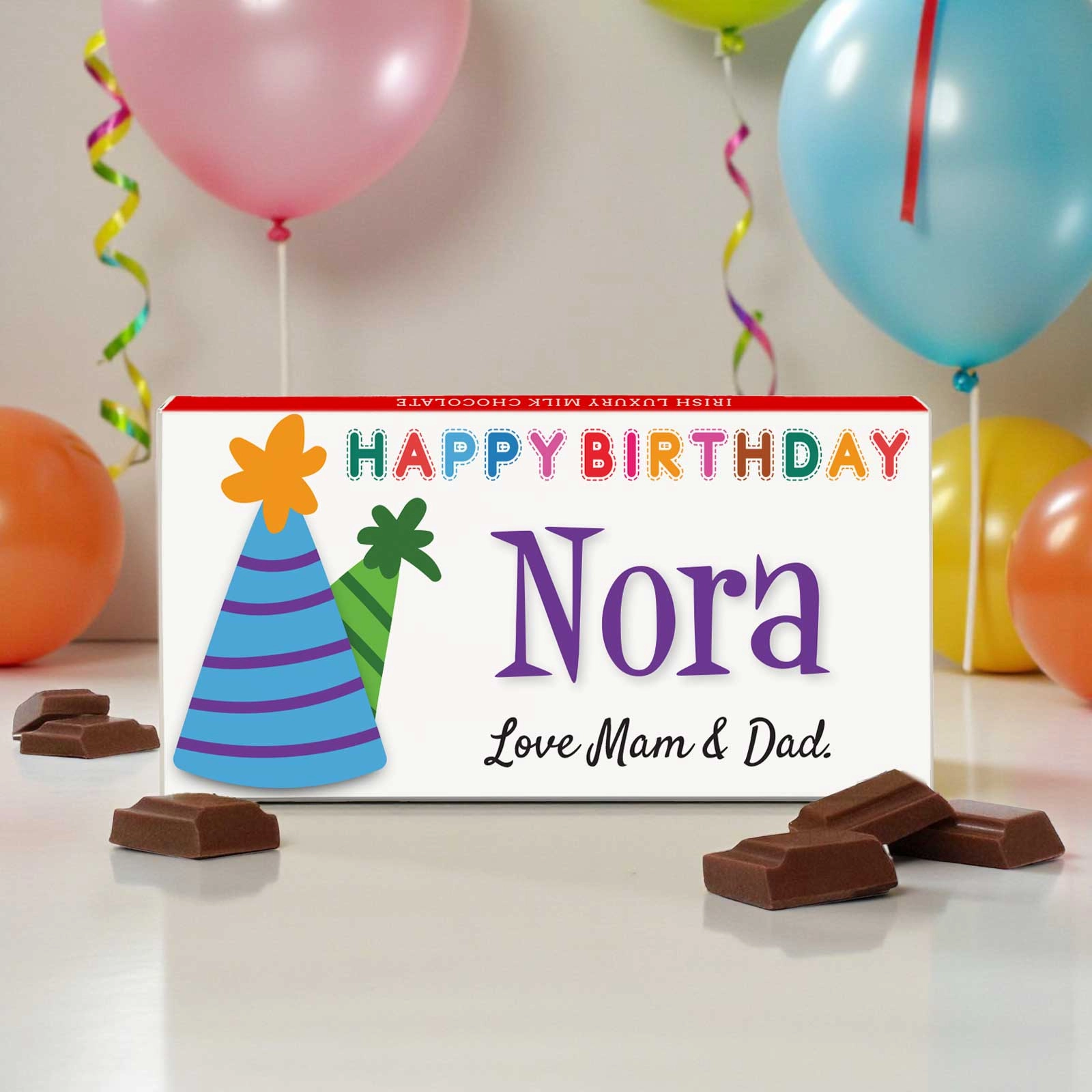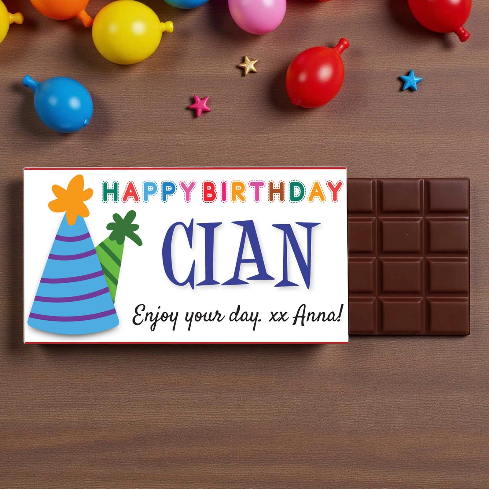 Celebrate your loved one's special day with our delightful Happy Birthday Hats Personalised Chocolate Bar 90g. This charming chocolate bar can be customised with a name and a heartfelt message, creating a truly unique and thoughtful birthday gift that will bring a smile to anyone’s face.