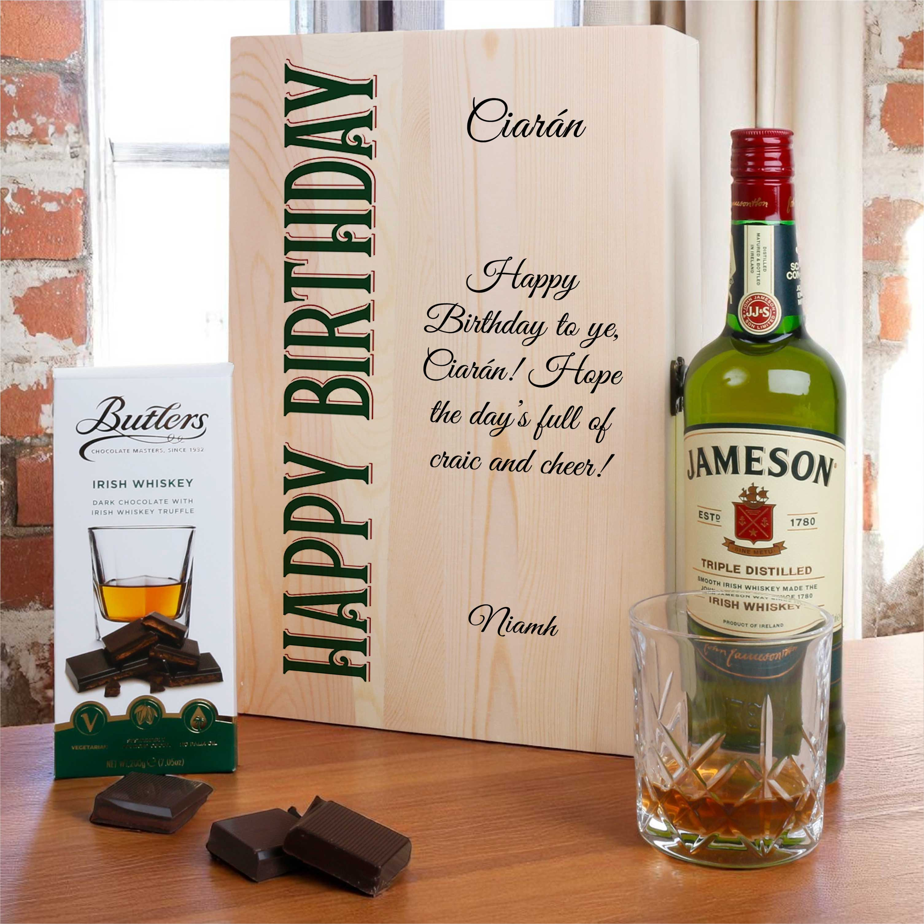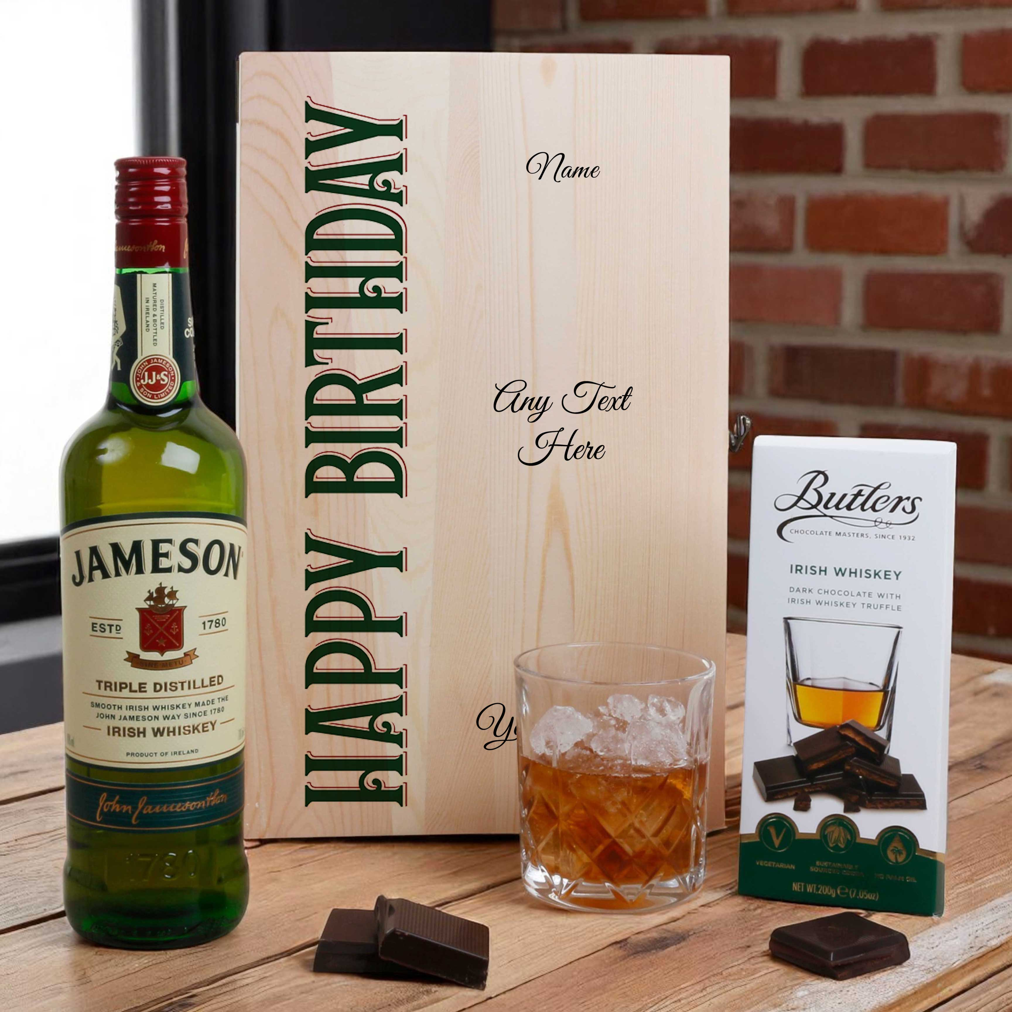 Beautifully presented in a premium wooden box printed with a bold Happy Birthday design, this set includes a bottle of Irish whiskey of your choice, a whiskey tumbler, and a bar of Butlers Irish Whiskey chocolate. Add a personal touch with a custom name, message, and date, printed directly onto the lid using high-resolution UV technology.