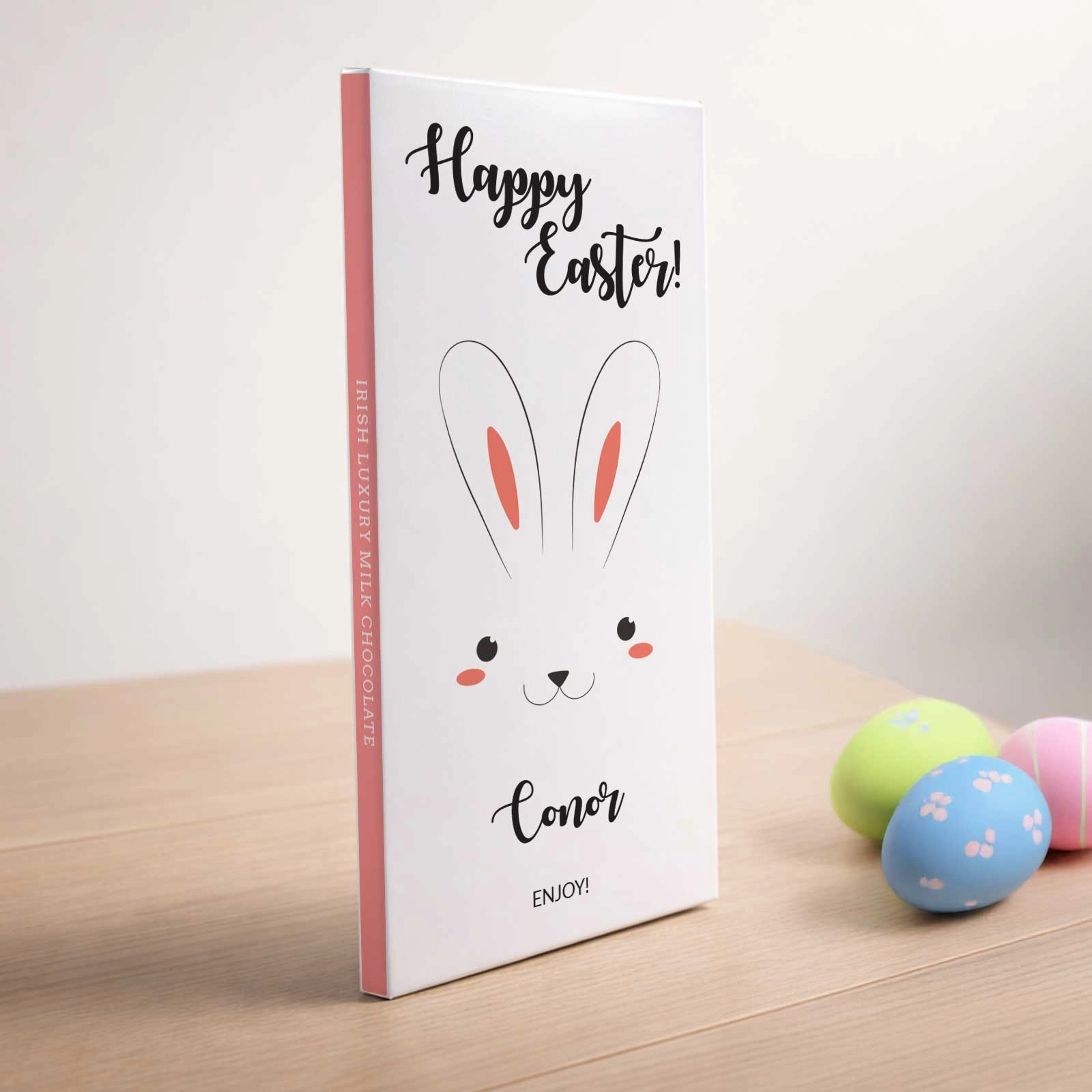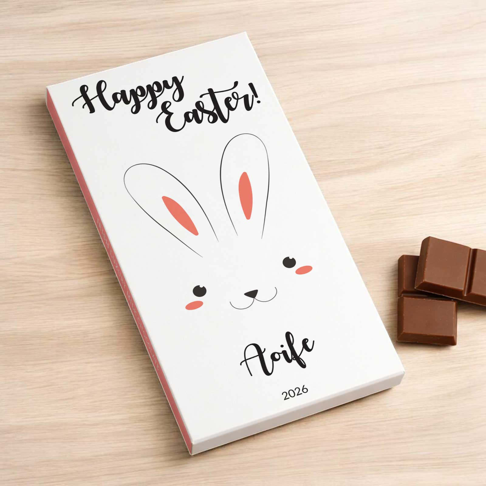 This generous 90g milk chocolate bar is crafted with care in County Cork, Ireland, using high-quality ingredients for a rich, creamy taste. The charming, personalised bunny face wrapper can be customised with your recipient’s name and a special message, making this gift truly unique and memorable.