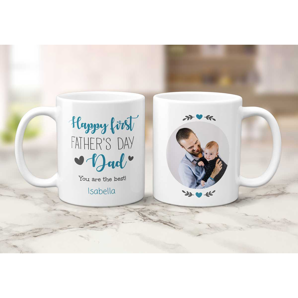 The mug is personalised with your photo and message as illustrated.