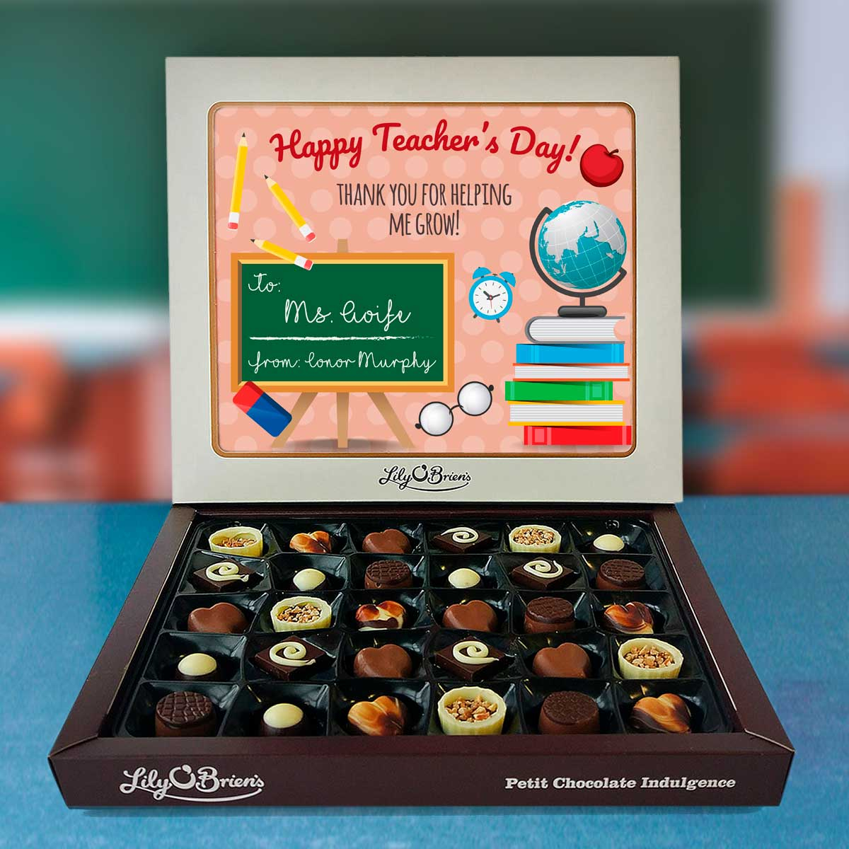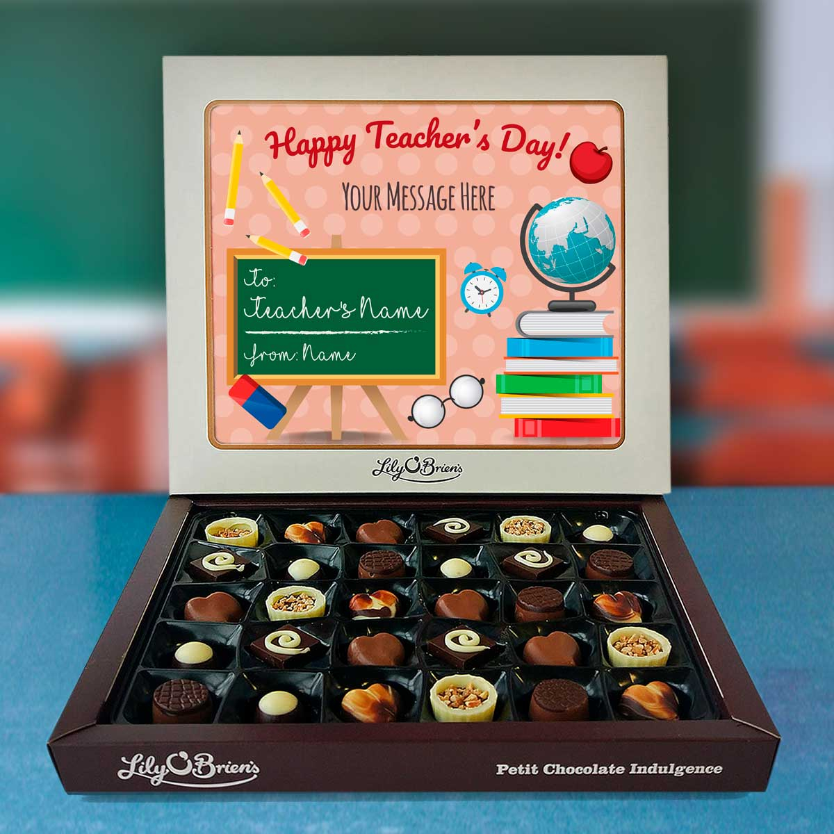 This Personalised Chocolate Box is filled with the Lily O'Brien's Luxury Chocolate collection. Approximate box dimensions: 290mm x 240mm x 40mm.