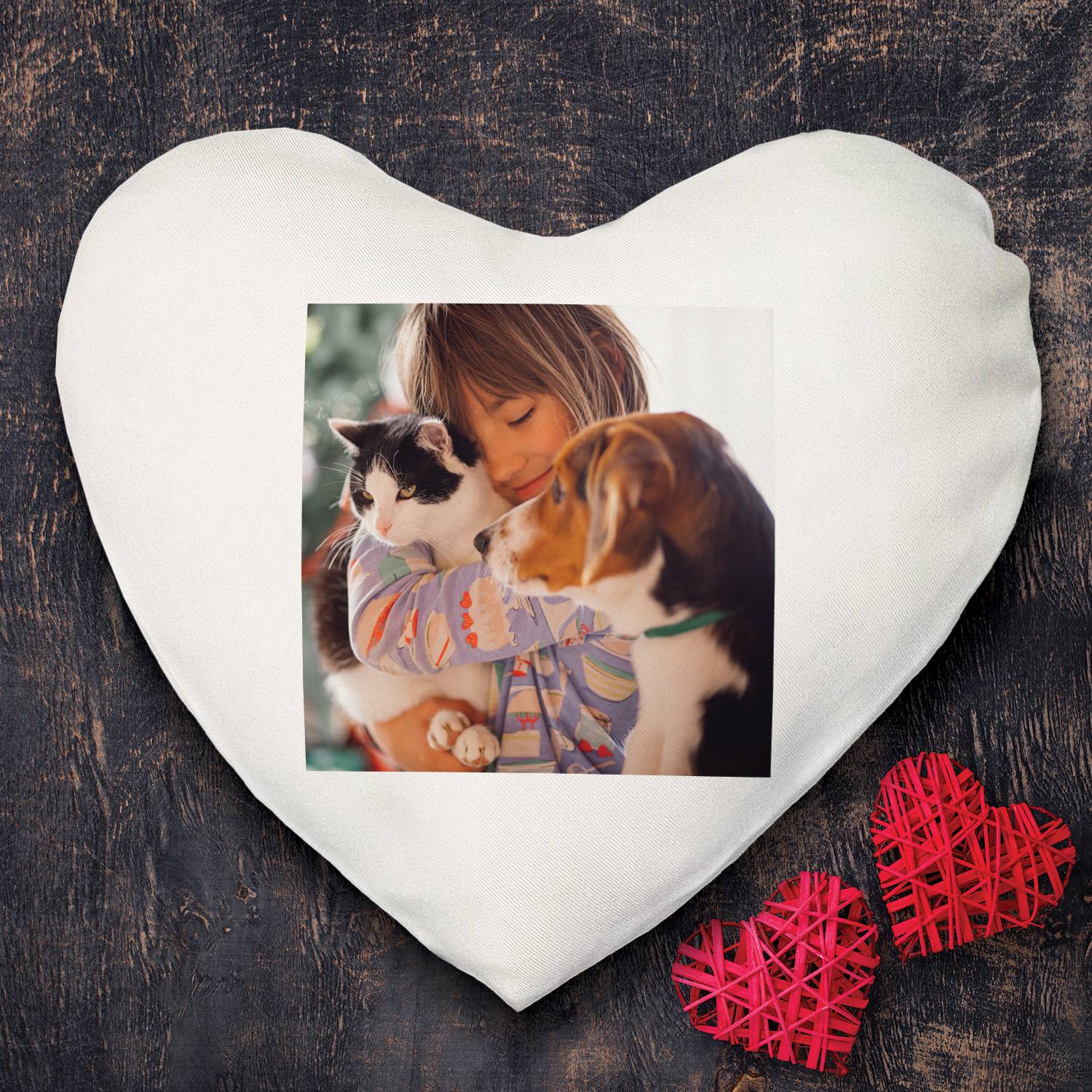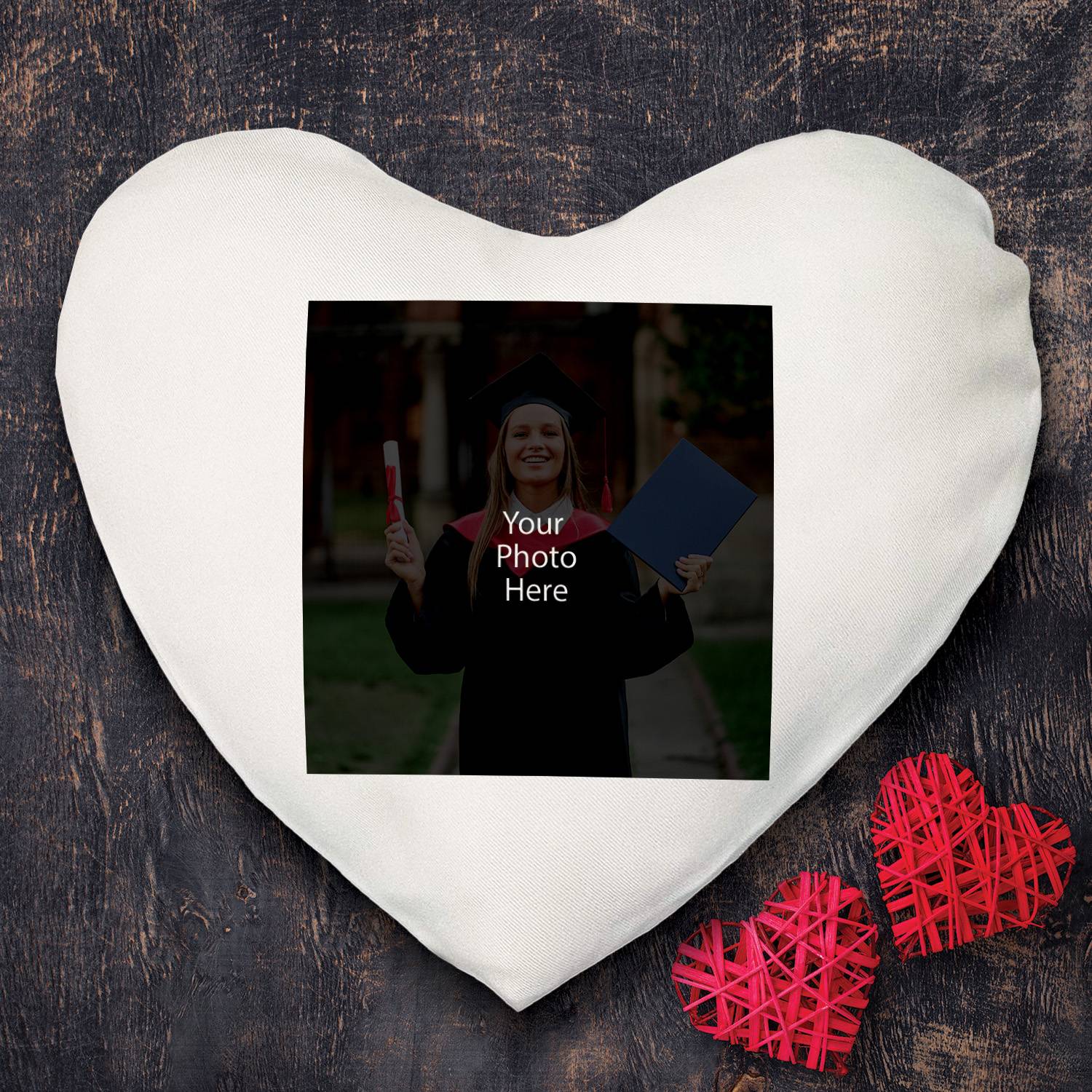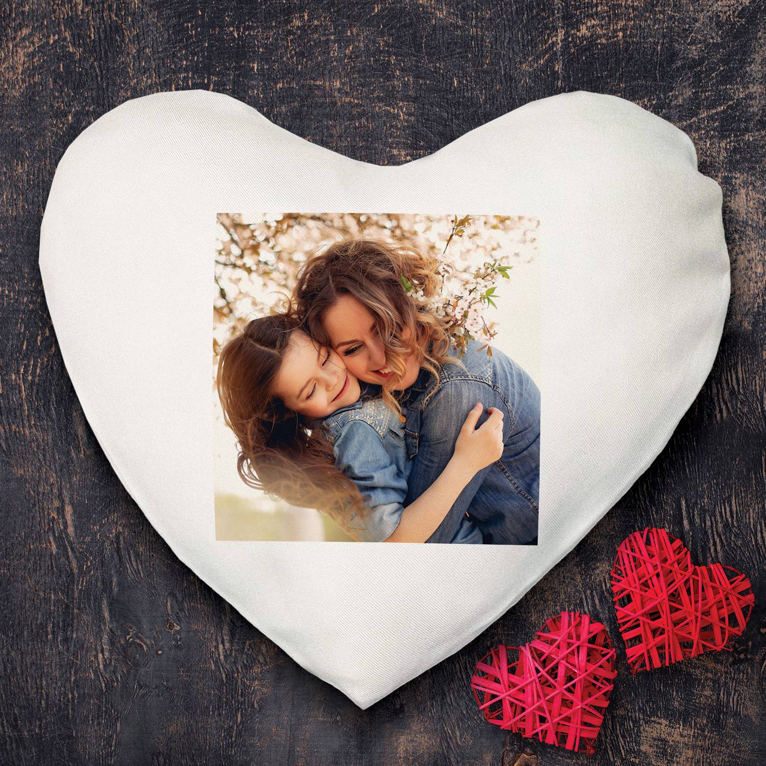 This personalised heart shaped polyester cushion with filling. makes a great gift! We print your photo directly on to the cushion cover in vibrant colour.
