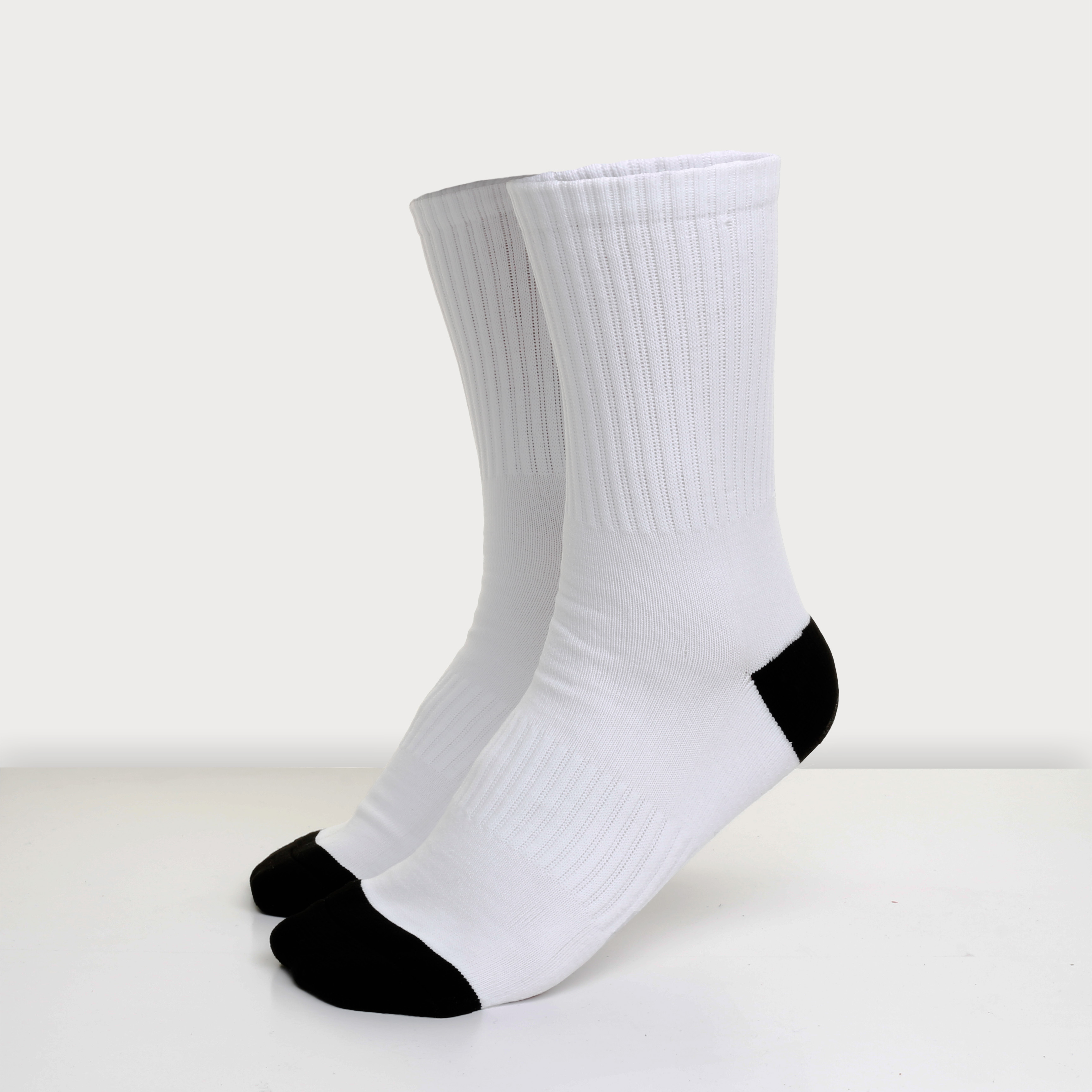One size, 42-47cm, 100% polyester. White with black heel and toe medium high socks.
