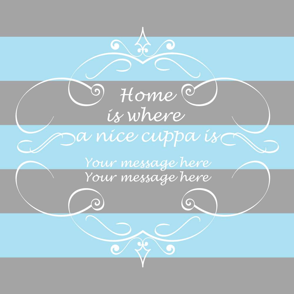 This personalised mug makes a fantastic gift for any occasion. A decorative swirling loop holds the words 'Home is where a nice cuppa is' against a striped background, with your added message this is a stylish way to celebrate any occasion.