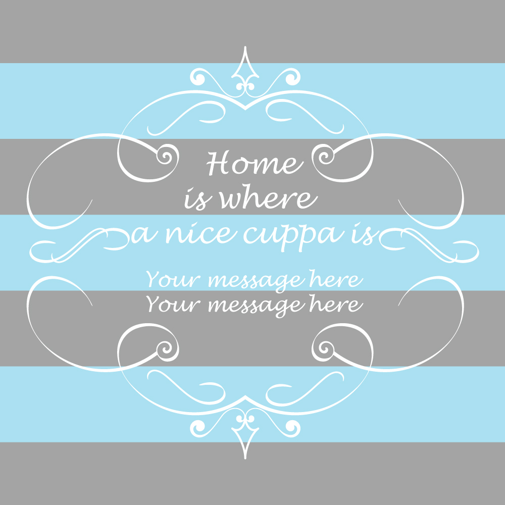 This personalised mug makes a fantastic gift for any occasion. A decorative swirling loop holds the words 'Home is where a nice cuppa is' against a striped background, with your added message this is a stylish way to celebrate any occasion.