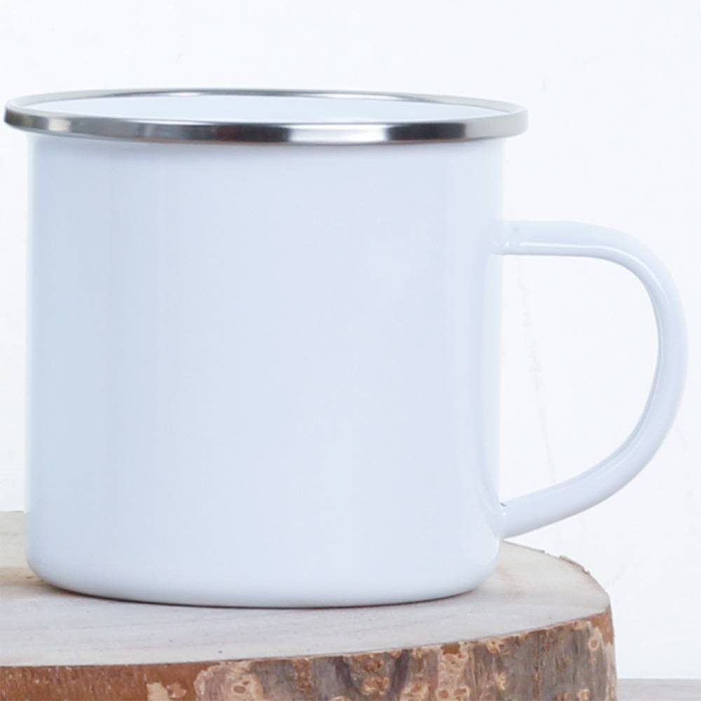 Available in a 12oz enamel mug with a black and silver rim option.