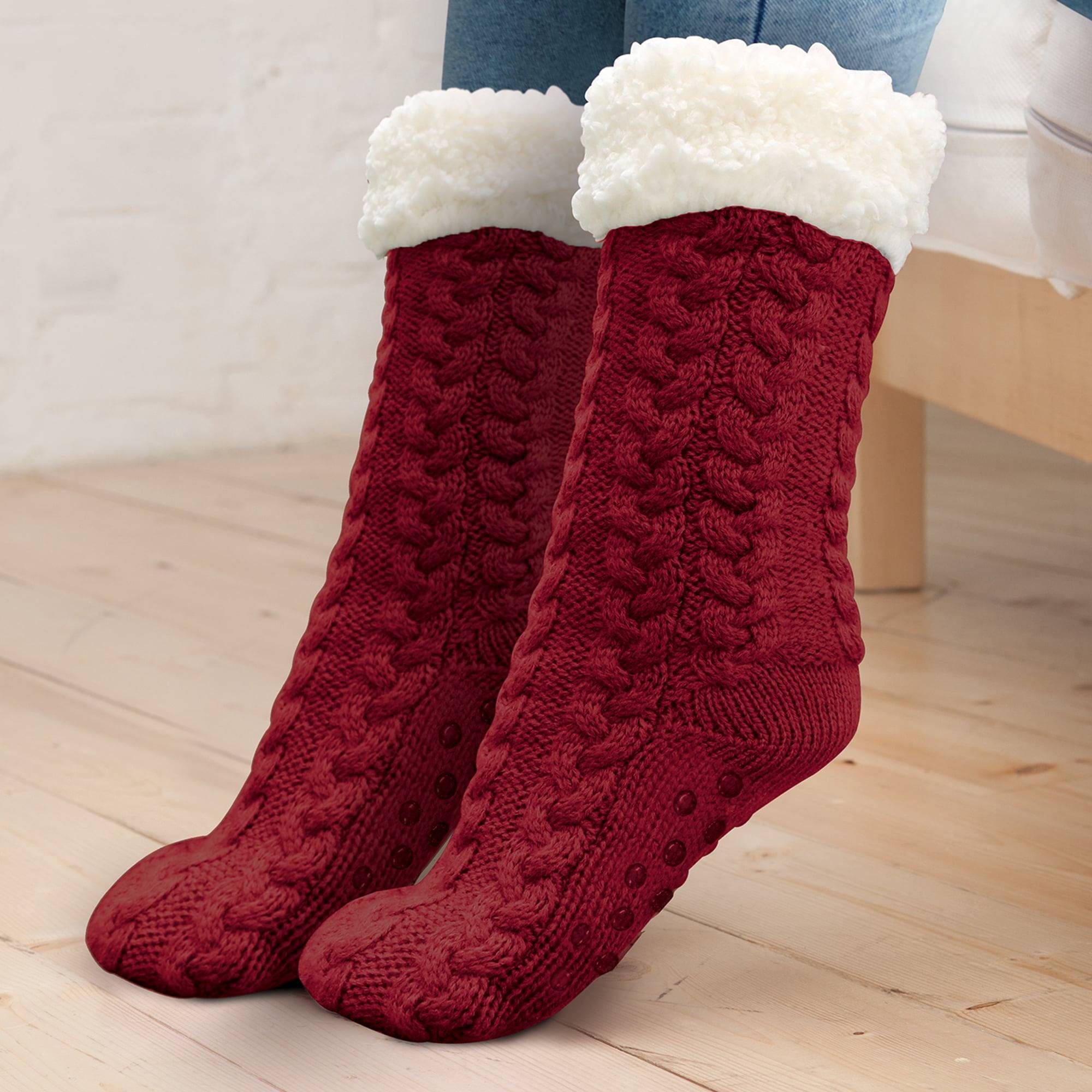 Huggle Socks, Fleece Slipper Crew Socks with Non-Slip Grips, Burgundy